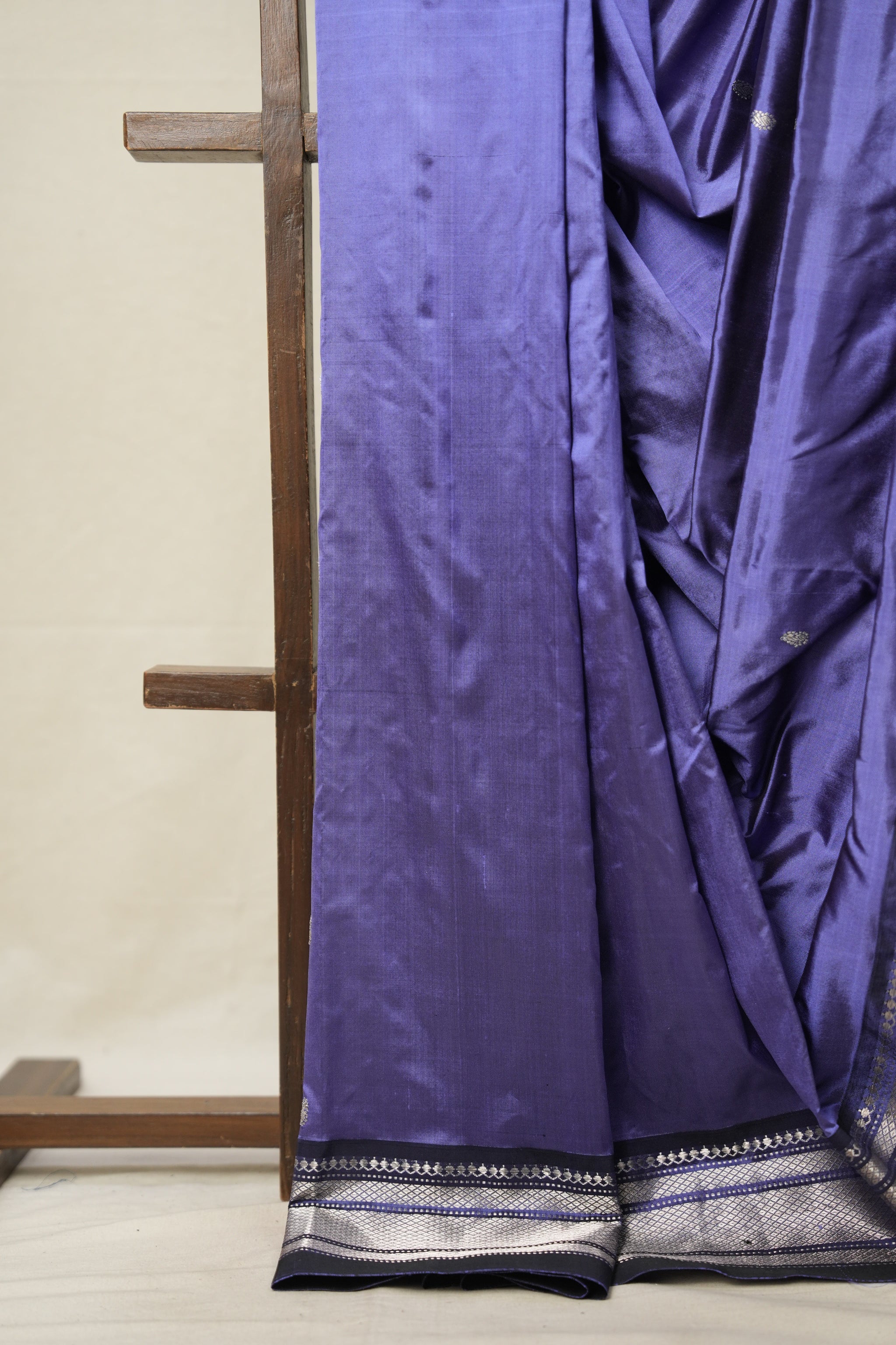 Work - The saree features big woven silver buttas (motifs) on the body, with a broad silver zari border and a rich contrast fancy pallu.