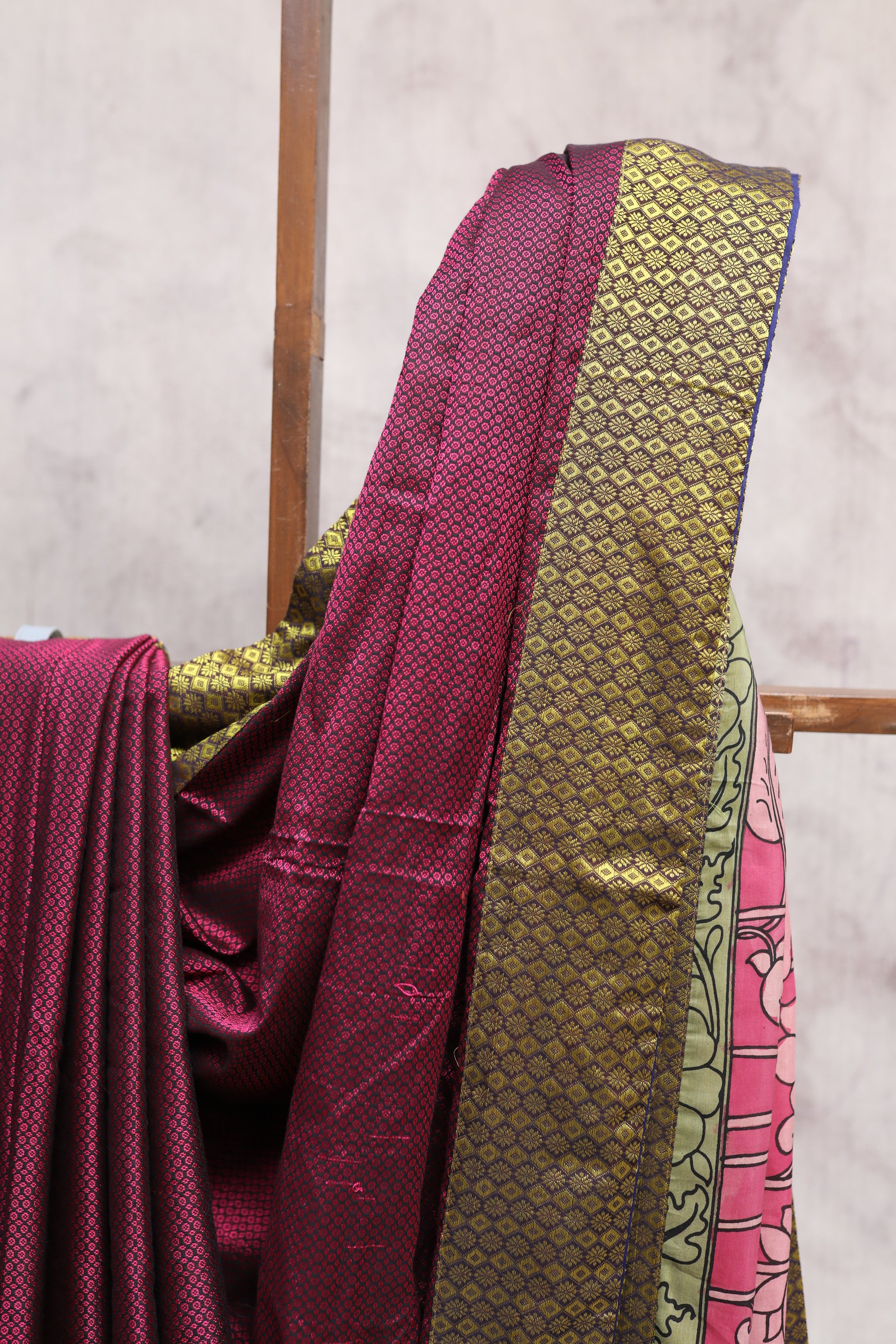 Powerloom magenta signature khun saree with yellow khun border. Beautiful pink kalamkari cotton pallu with yellow tassels. Saree has running blouse piece. Khun with 72% cotton 28% rayon art silk. No polyester used. Khun is a culturally significant fabric in Maharashtra and Karnataka. This signature khun saree has a perfect blend of ethnicity and modern style.
