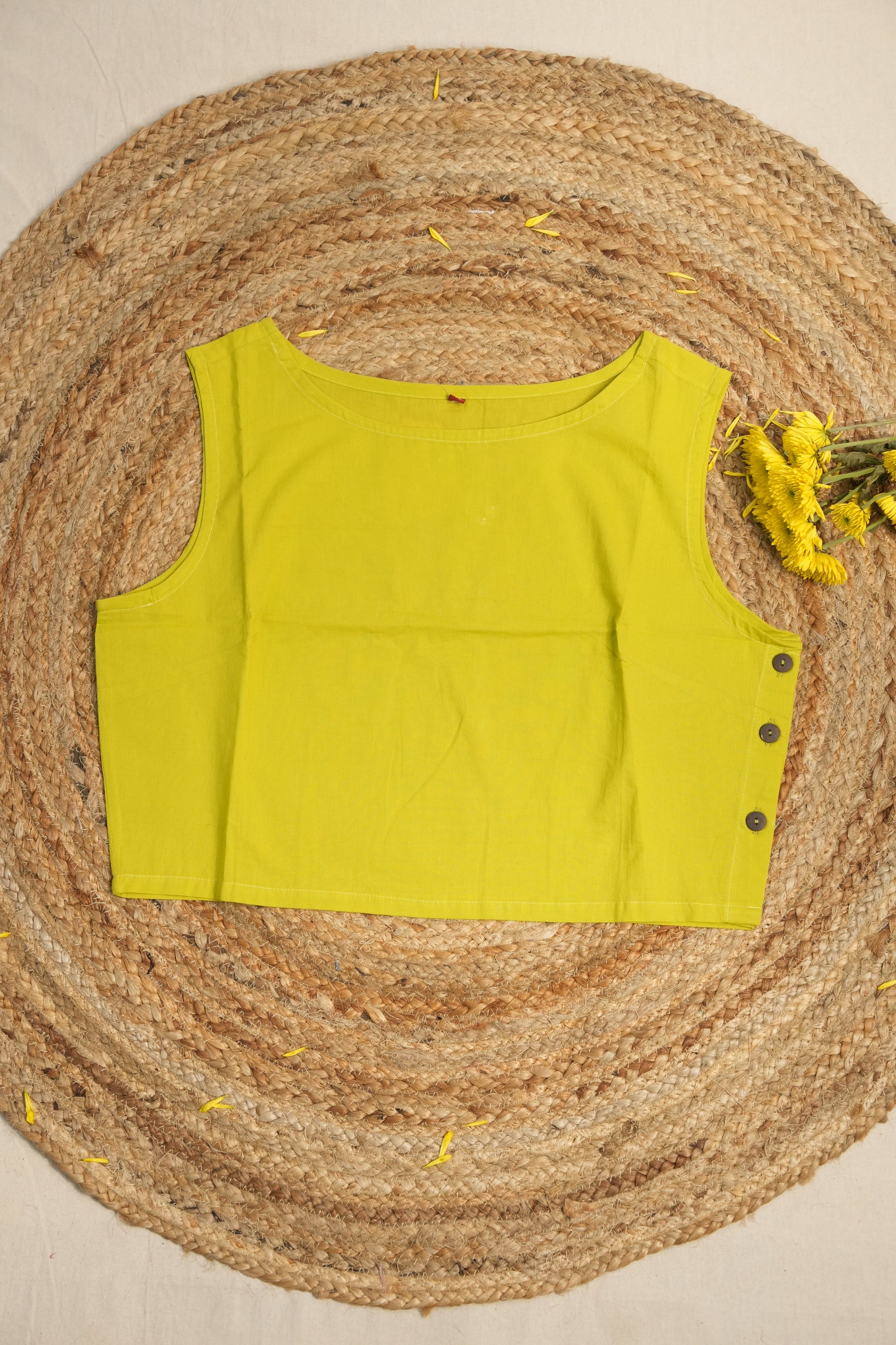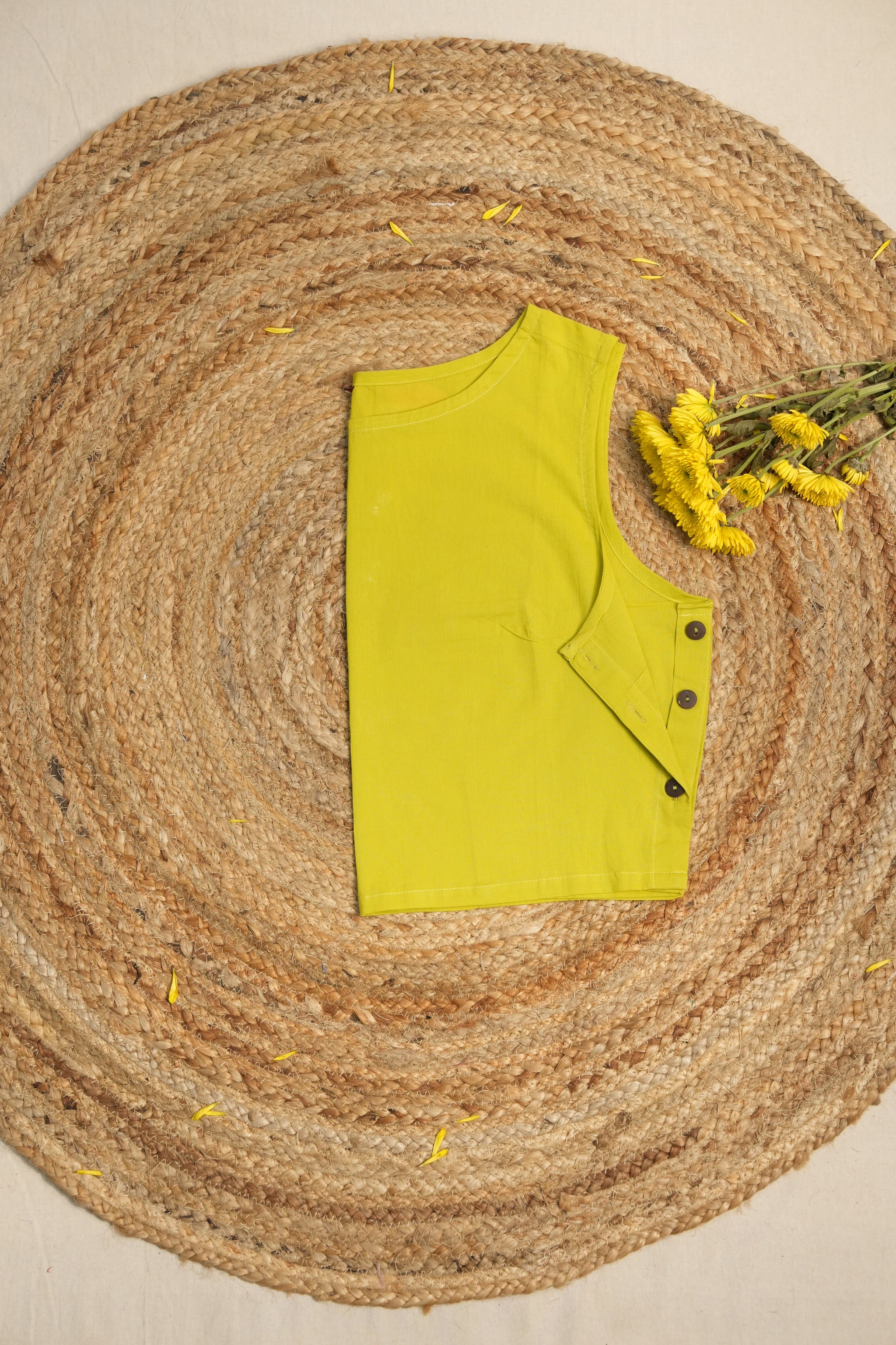 This neon green round-neck cotton blouse features fish shaped fabric embedded on the 3/4th sleeves and a front-opening design. It has a closed back and is made without pads and lining.