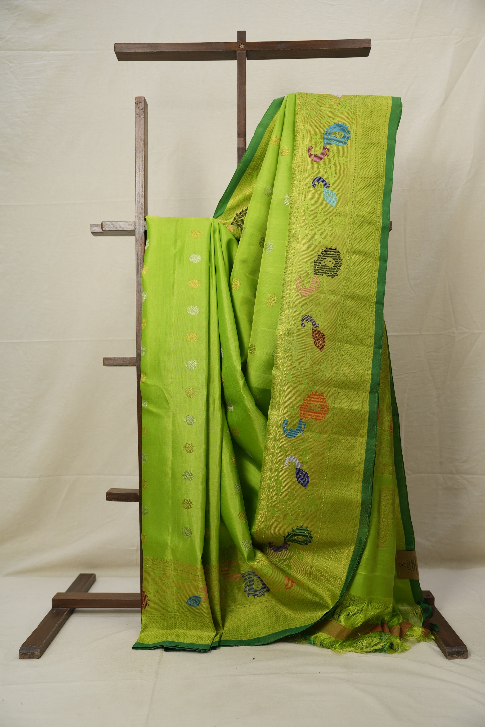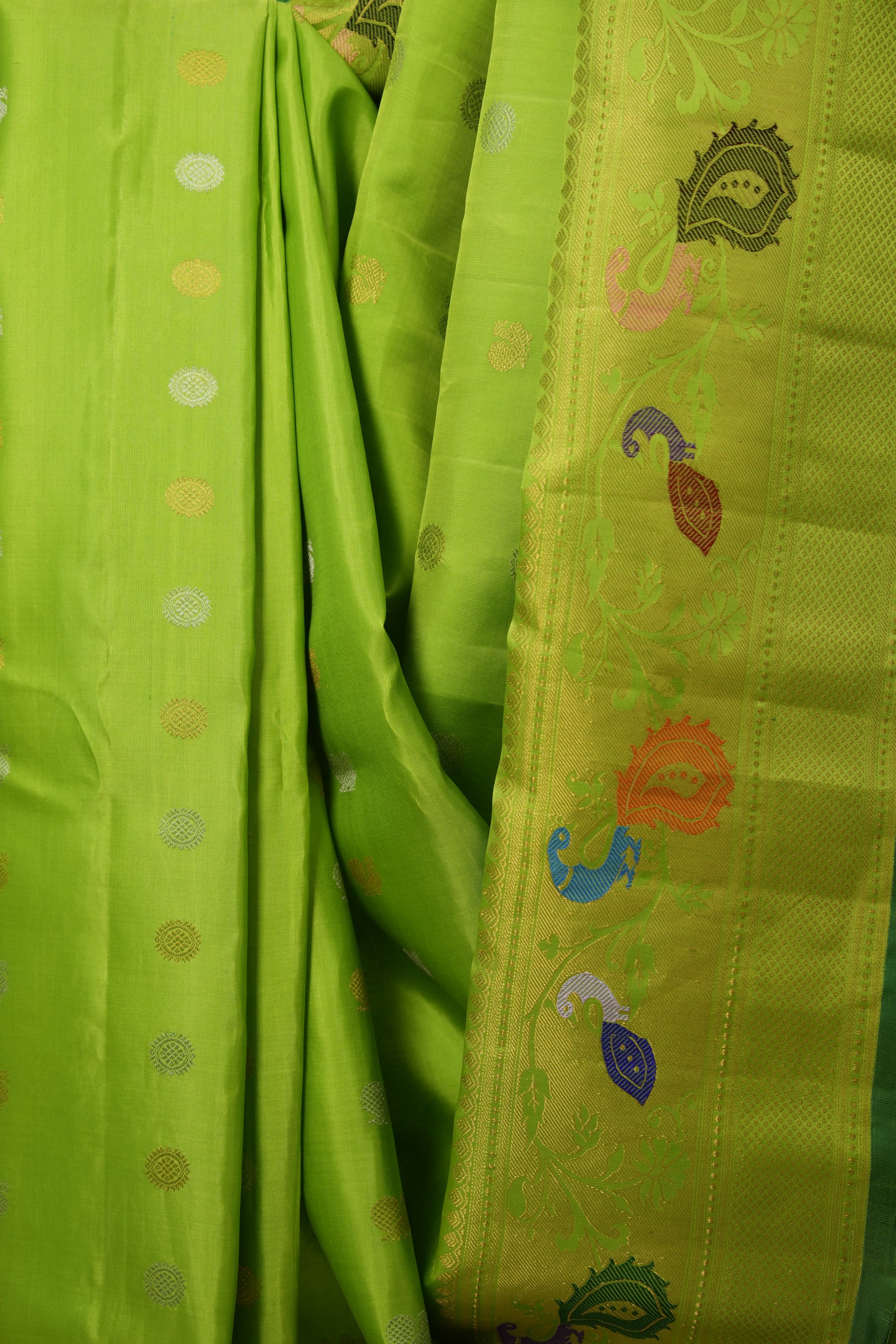 Work - This Gadwal silk saree features a neon green colour plain body adorned with small golden-silver buttas colour & with zari border with pallu. It features unique and attractive design.