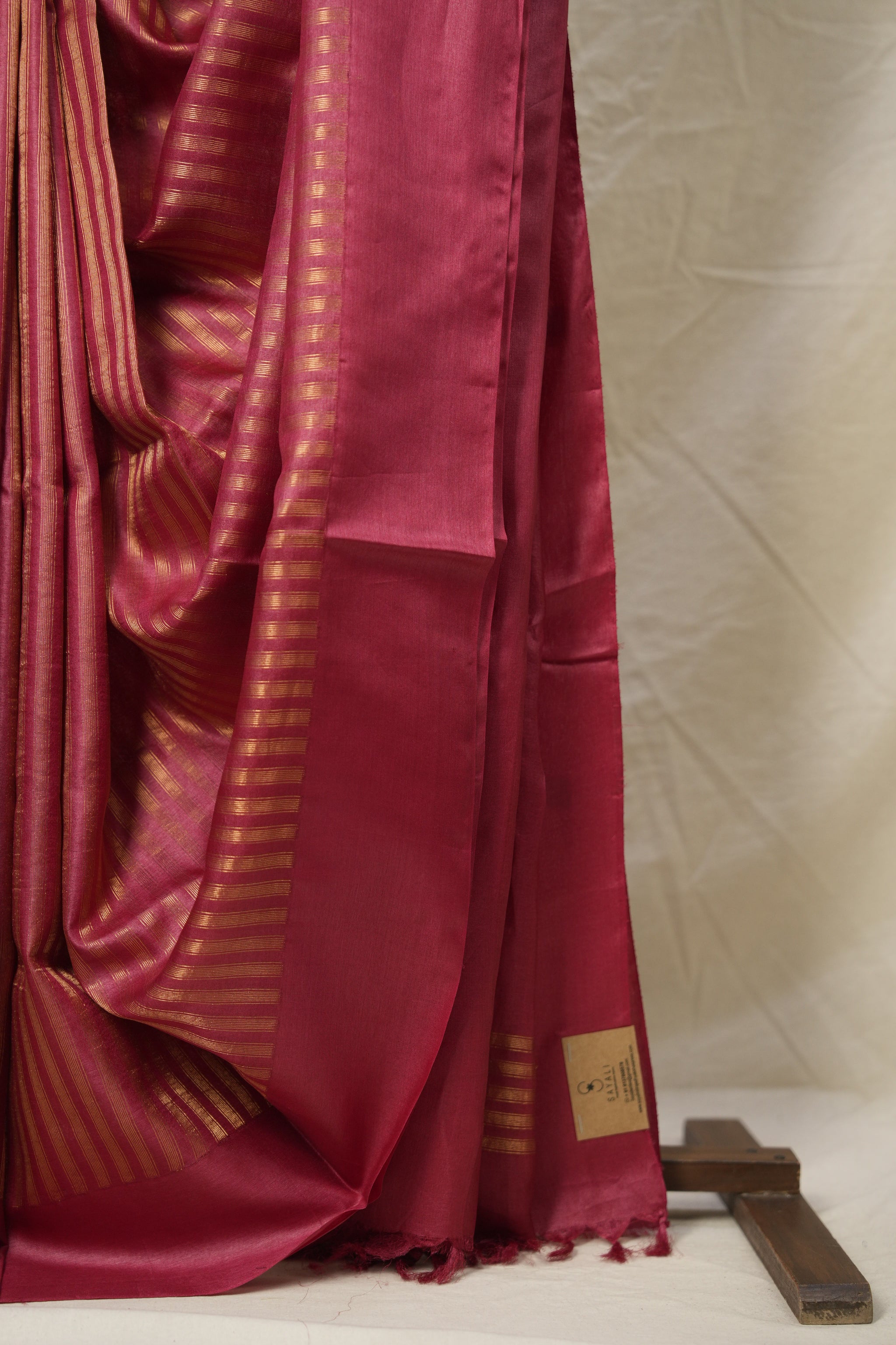Work - This is a tussar saree with a self-woven or stripes pattern and a subtle, ornate border.