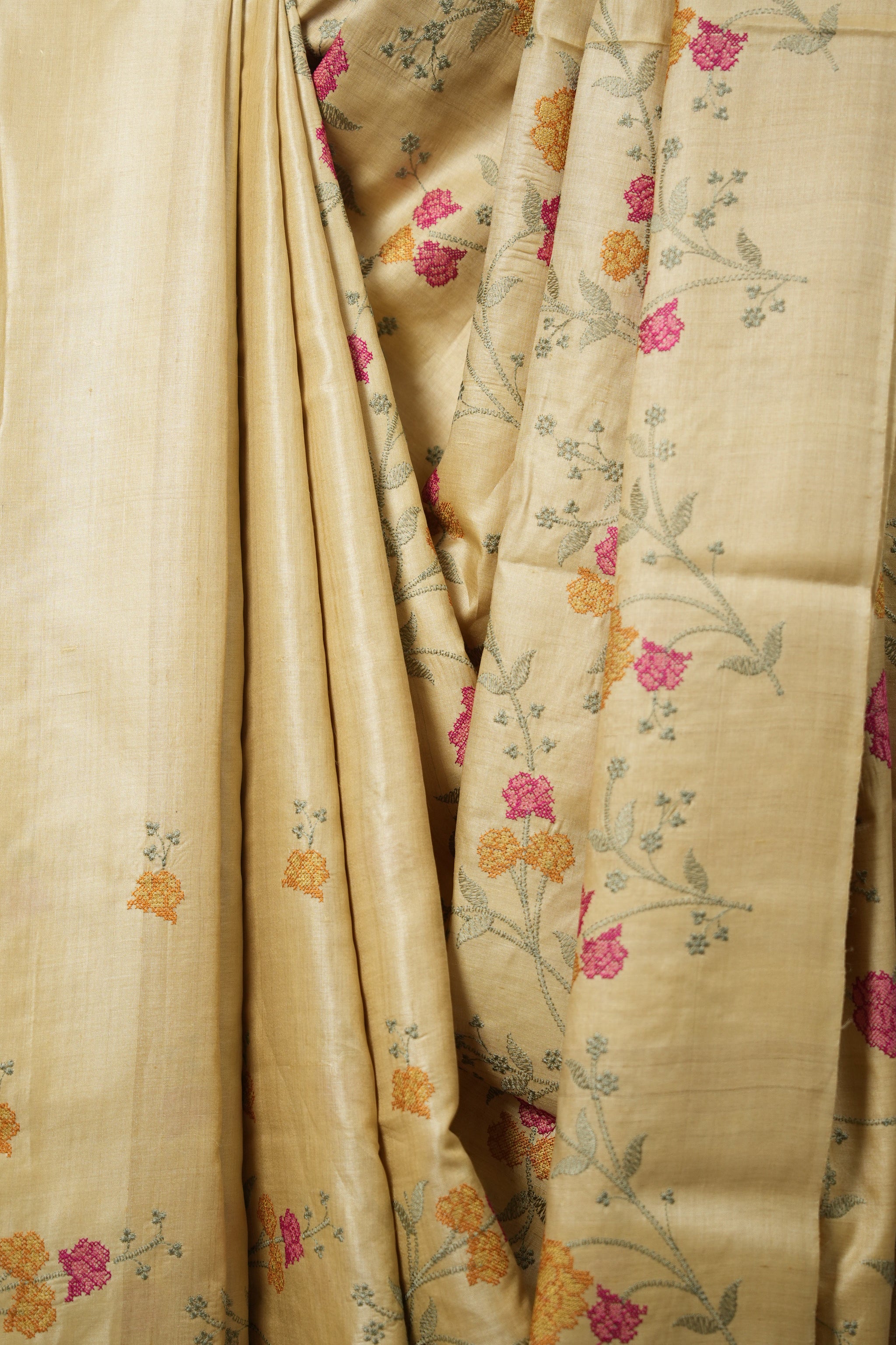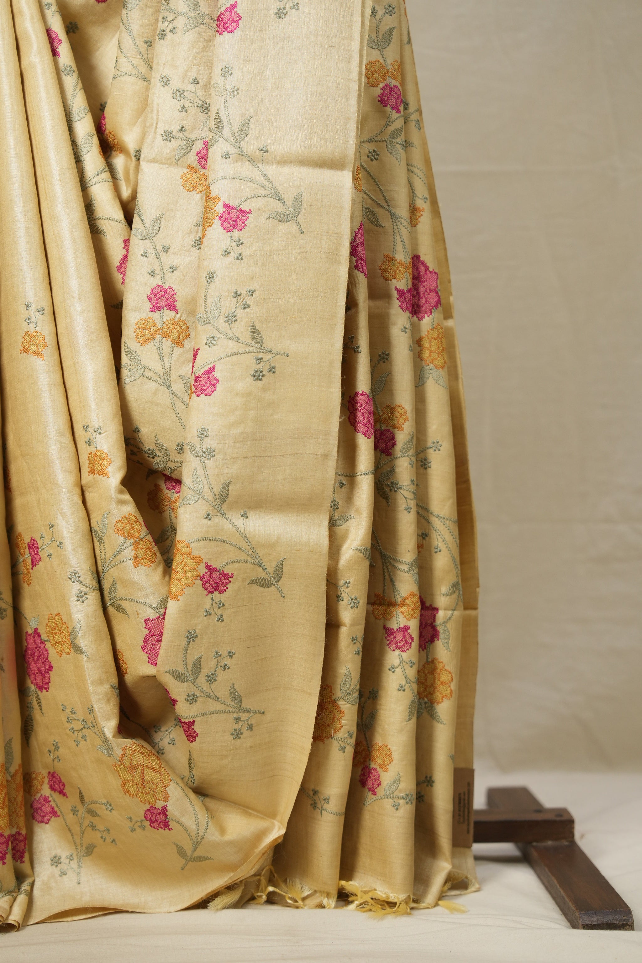 Work - This is a tussar silk saree with elegant multi-color floral embroidery work