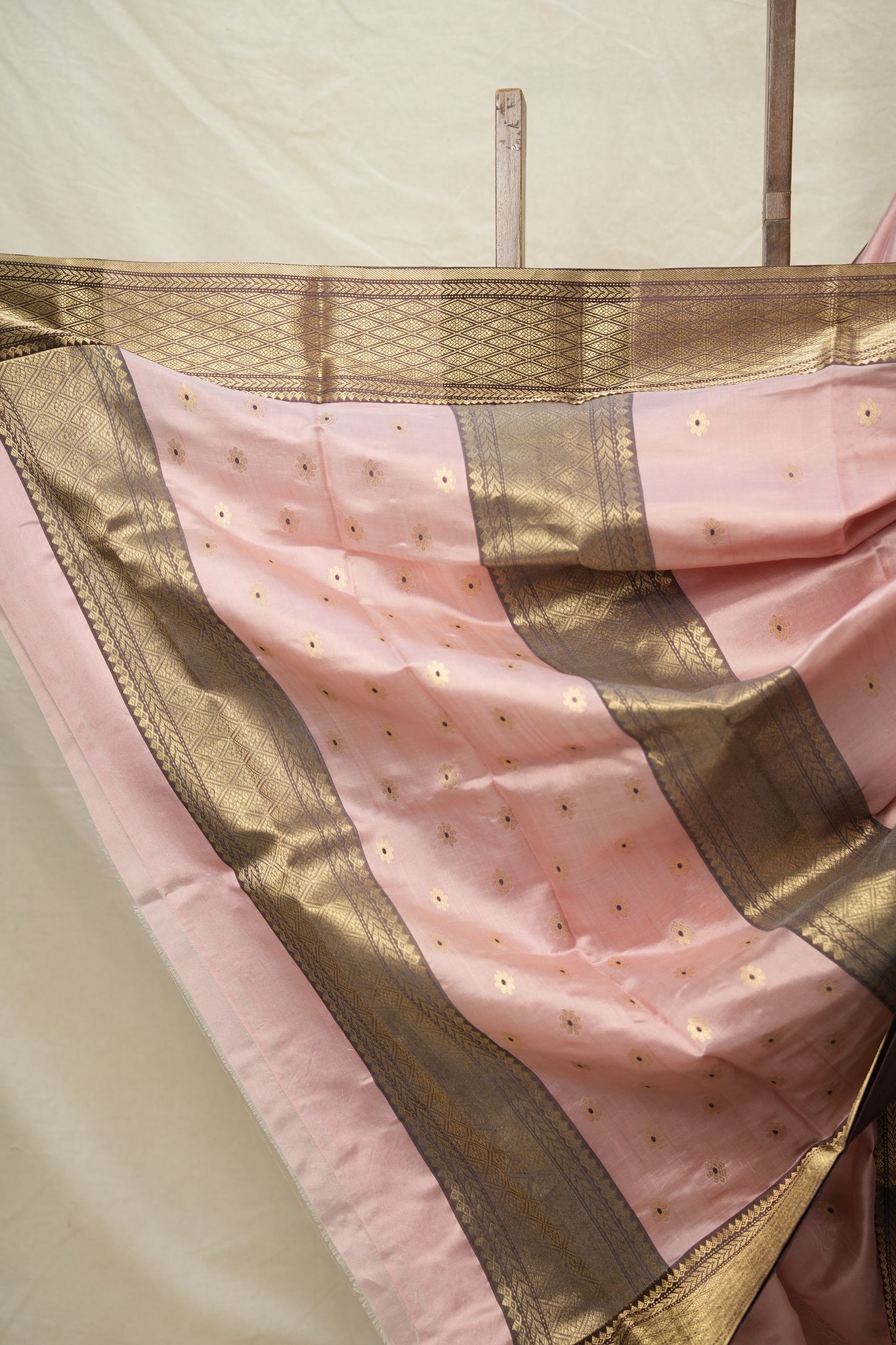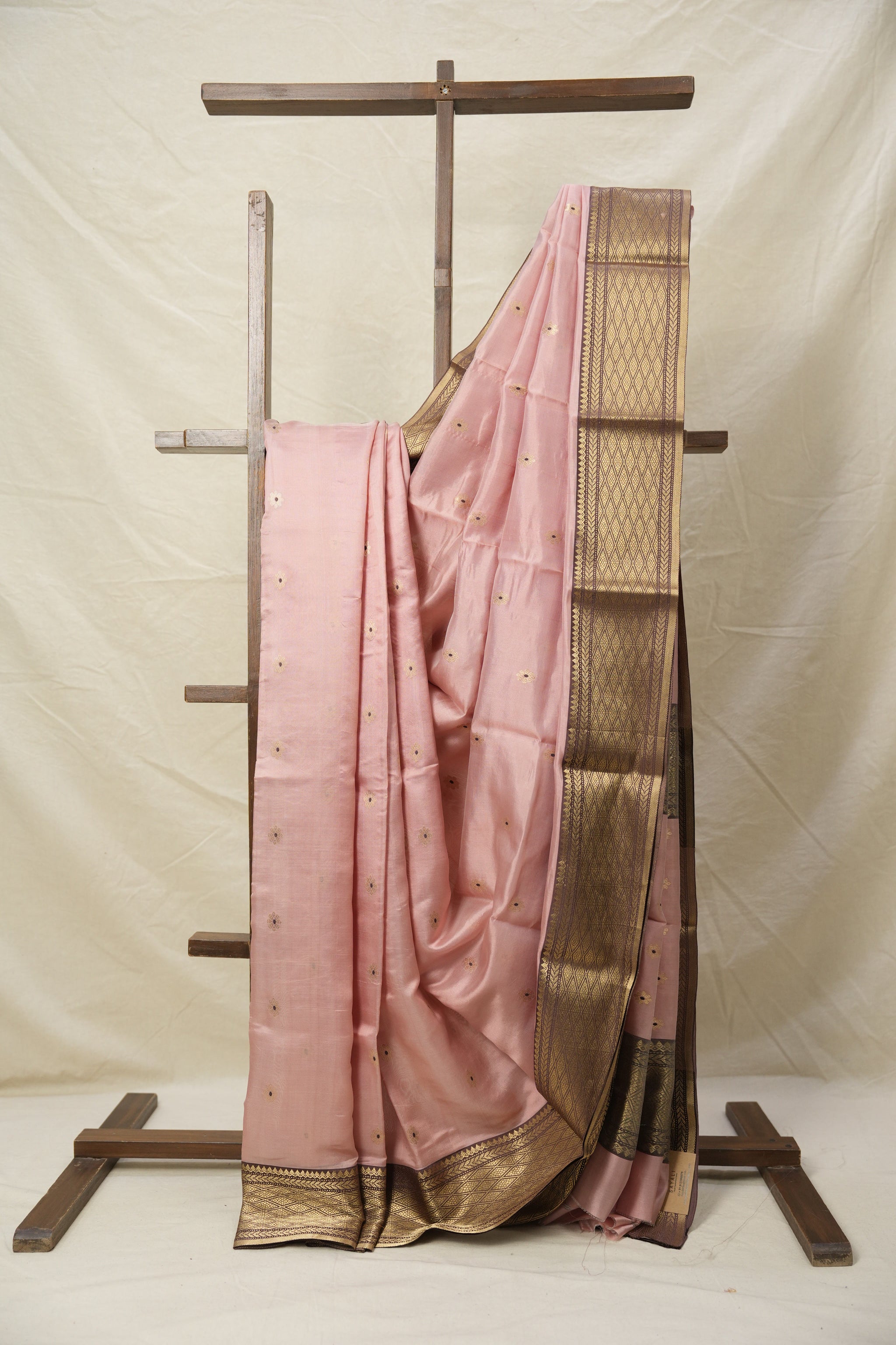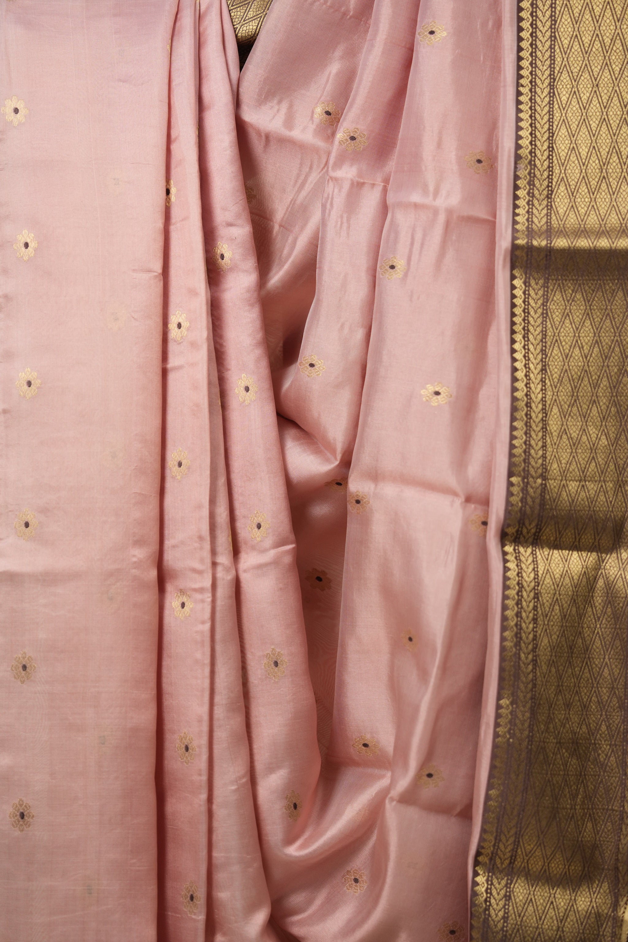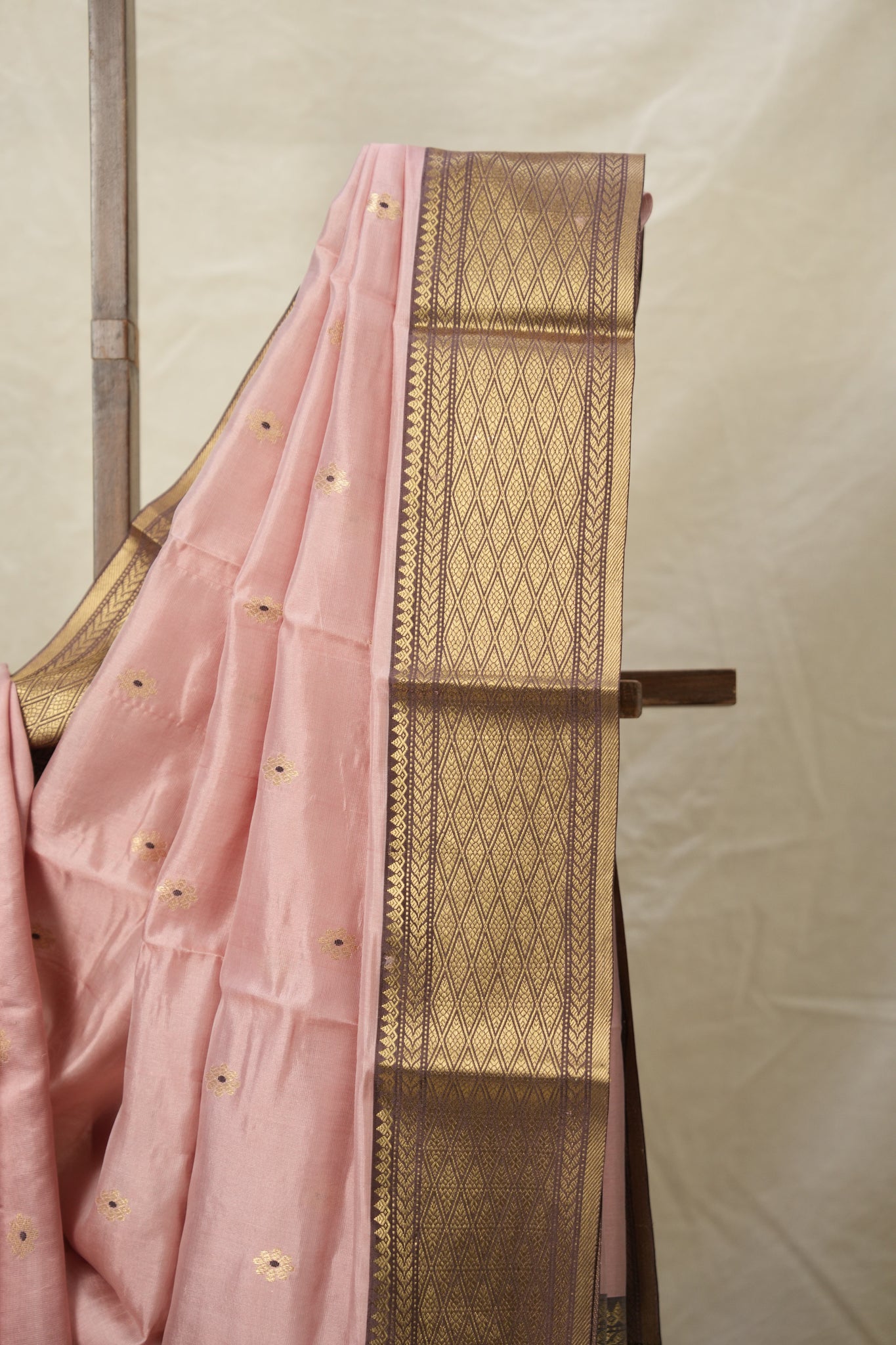 Work - Chanderi silk saree with pastel pink body, gold buti motifs, and contrast elegant gold zari border.
