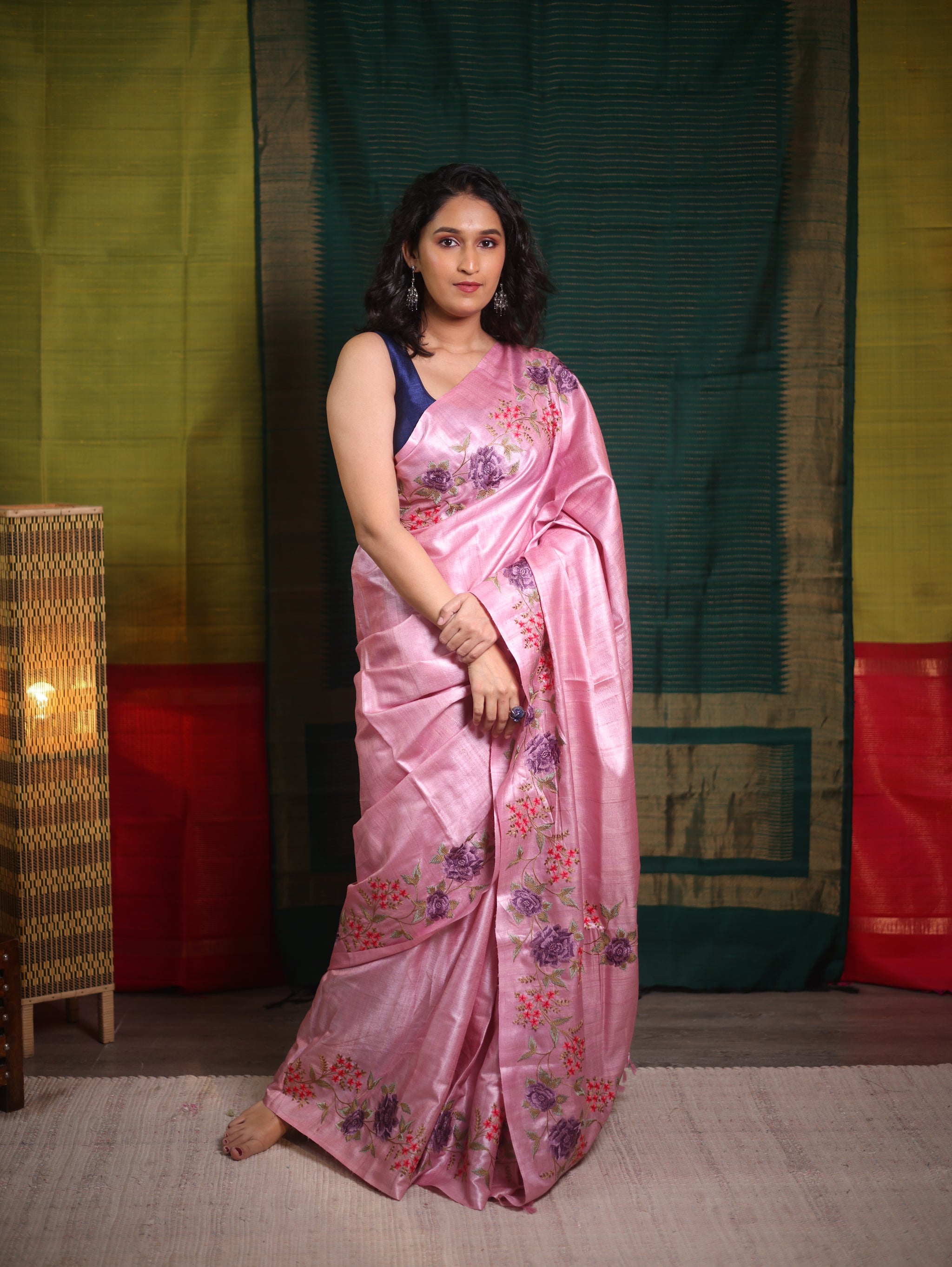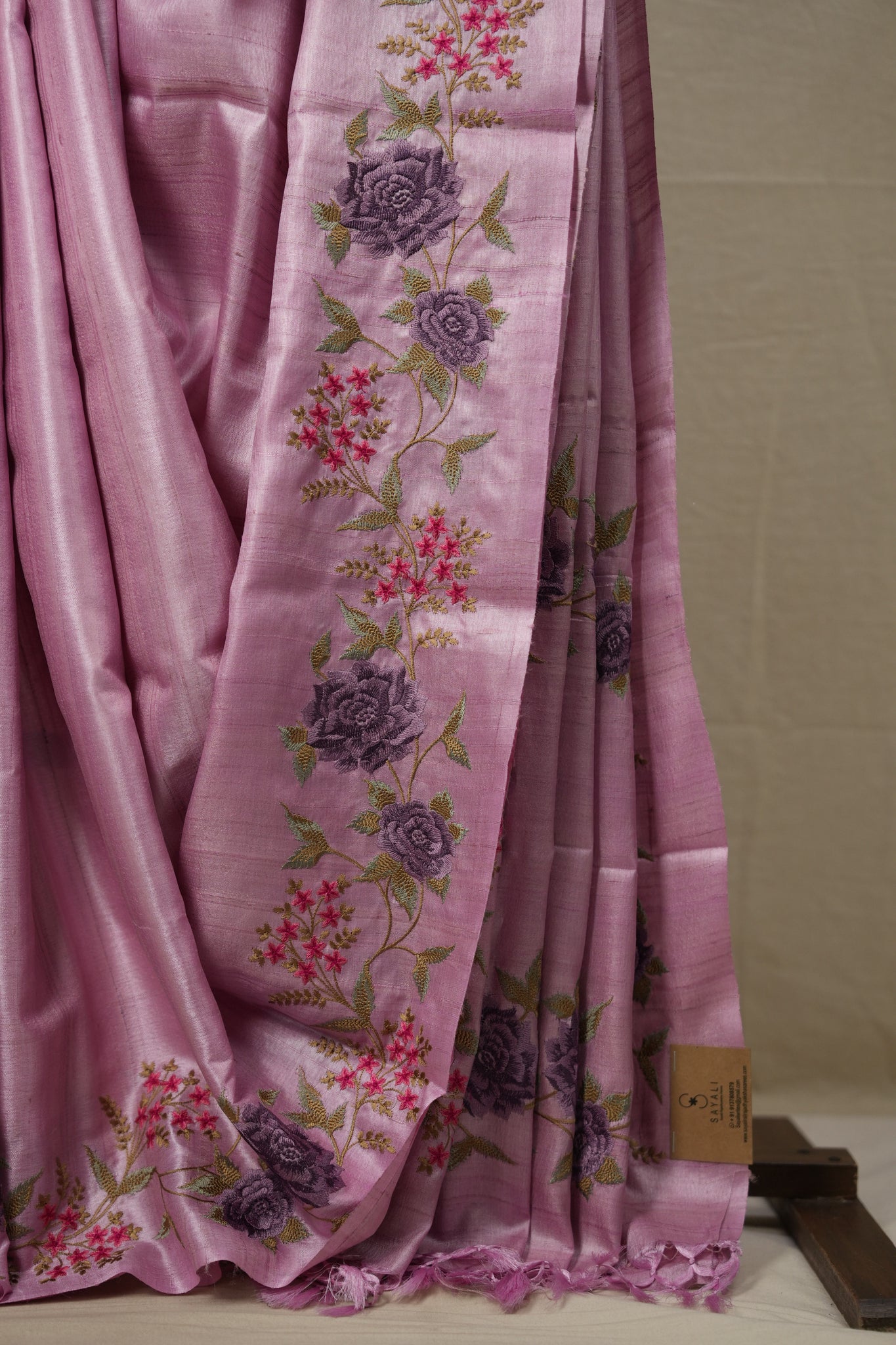 Work - This is a tussar silk saree with elegant multi-color floral embroidery work