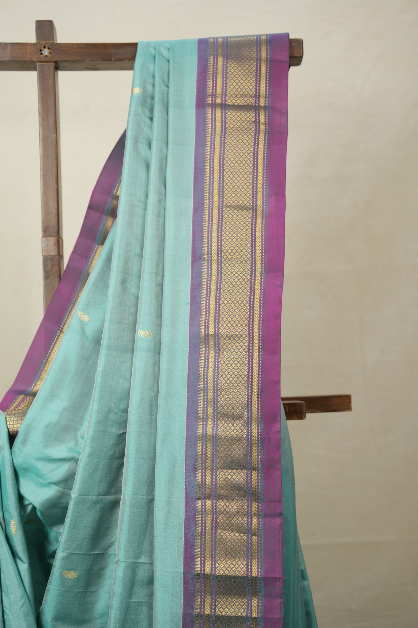 Work - The saree features big woven gold buttas (motifs) on the body, with a broad golden zari border and a rich contrast morbangdi pallu.