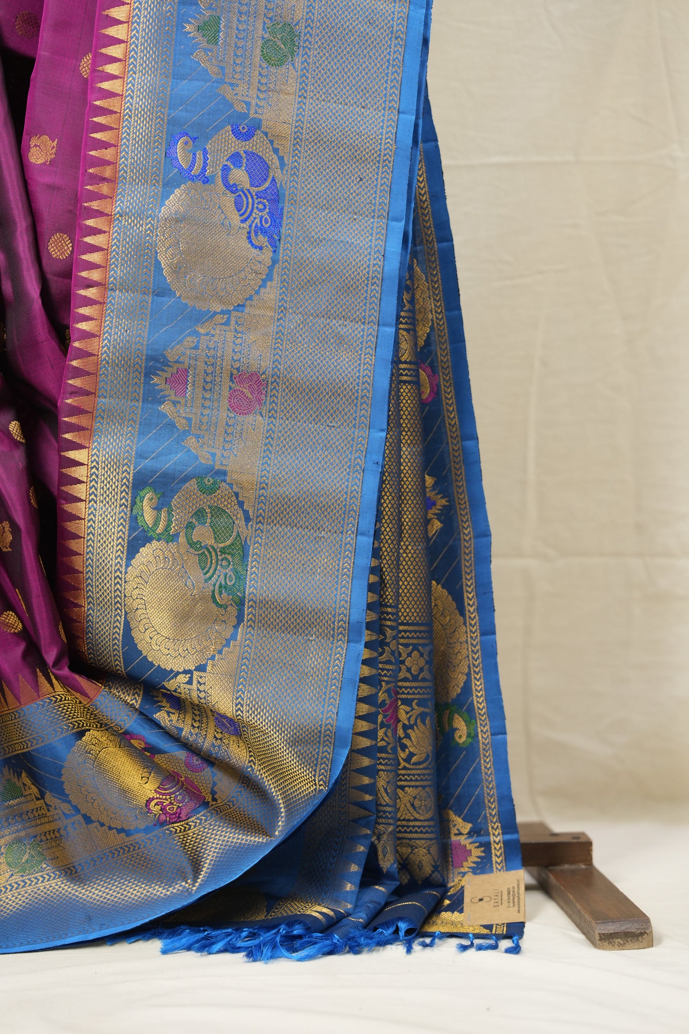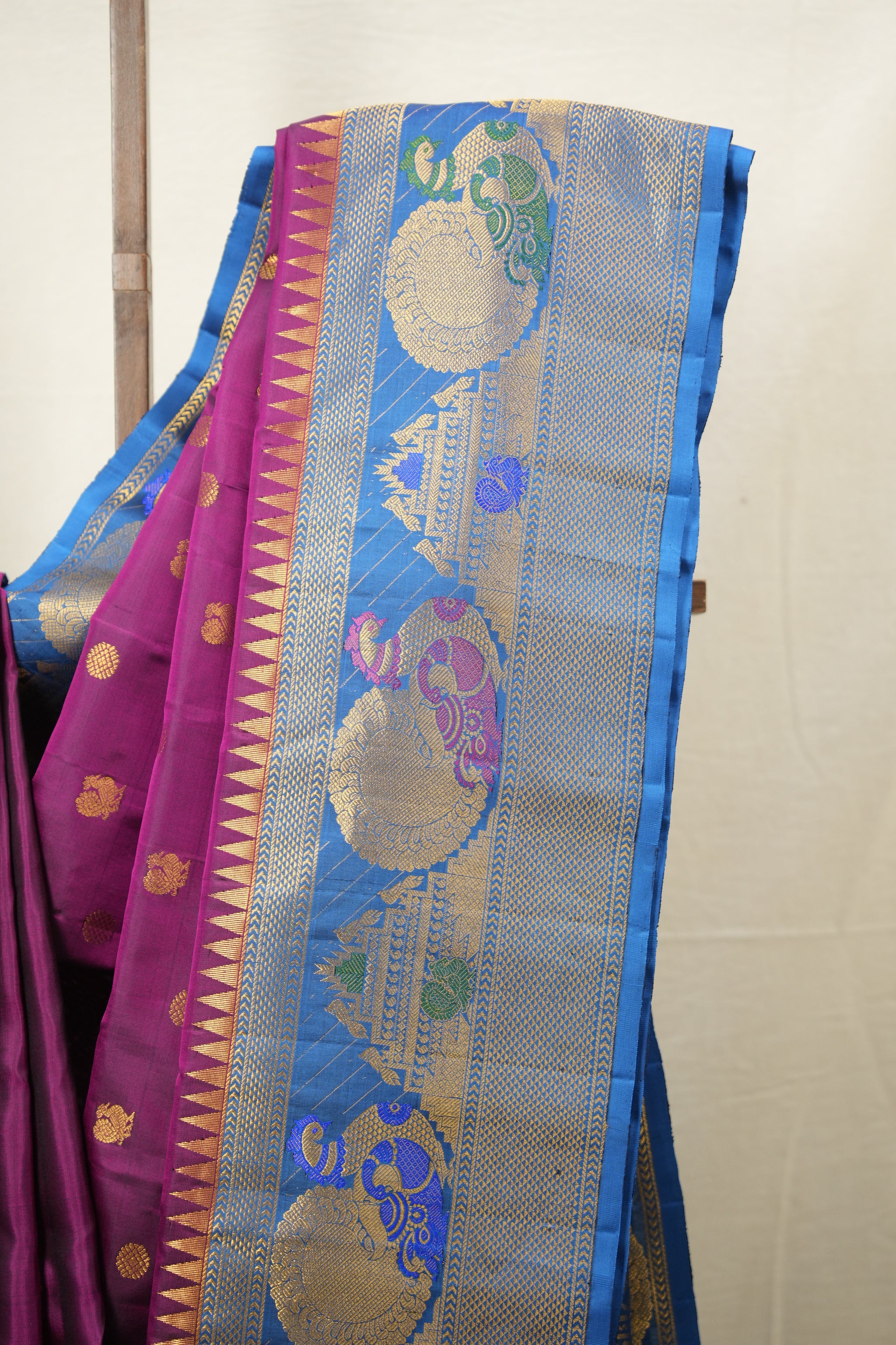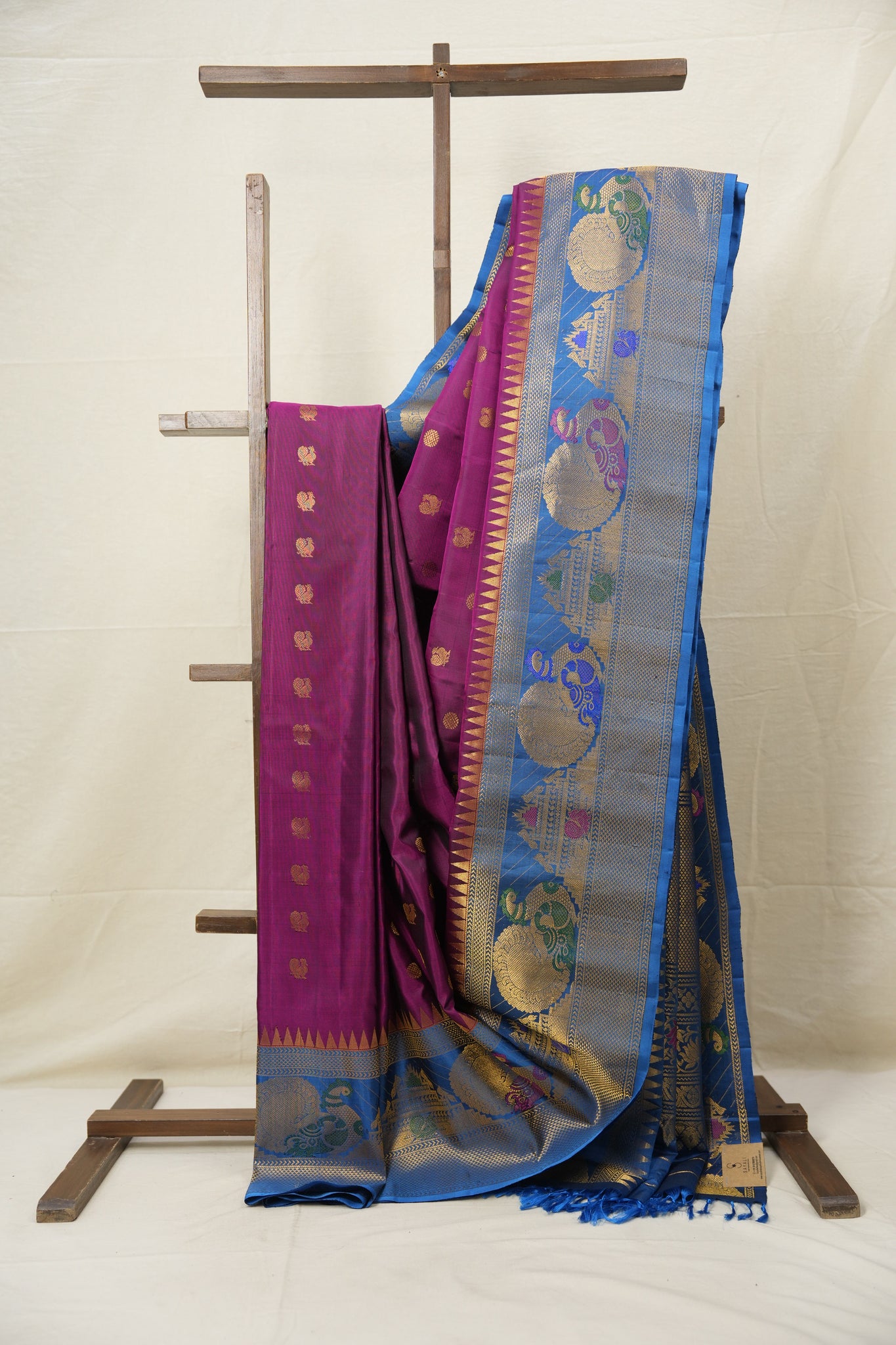 Work - This Gadwal silk saree features a rani pink colour plain body adorned with small golden buttas and a contrasting colour & zari border with brocade pallu. It features unique and attractive design.