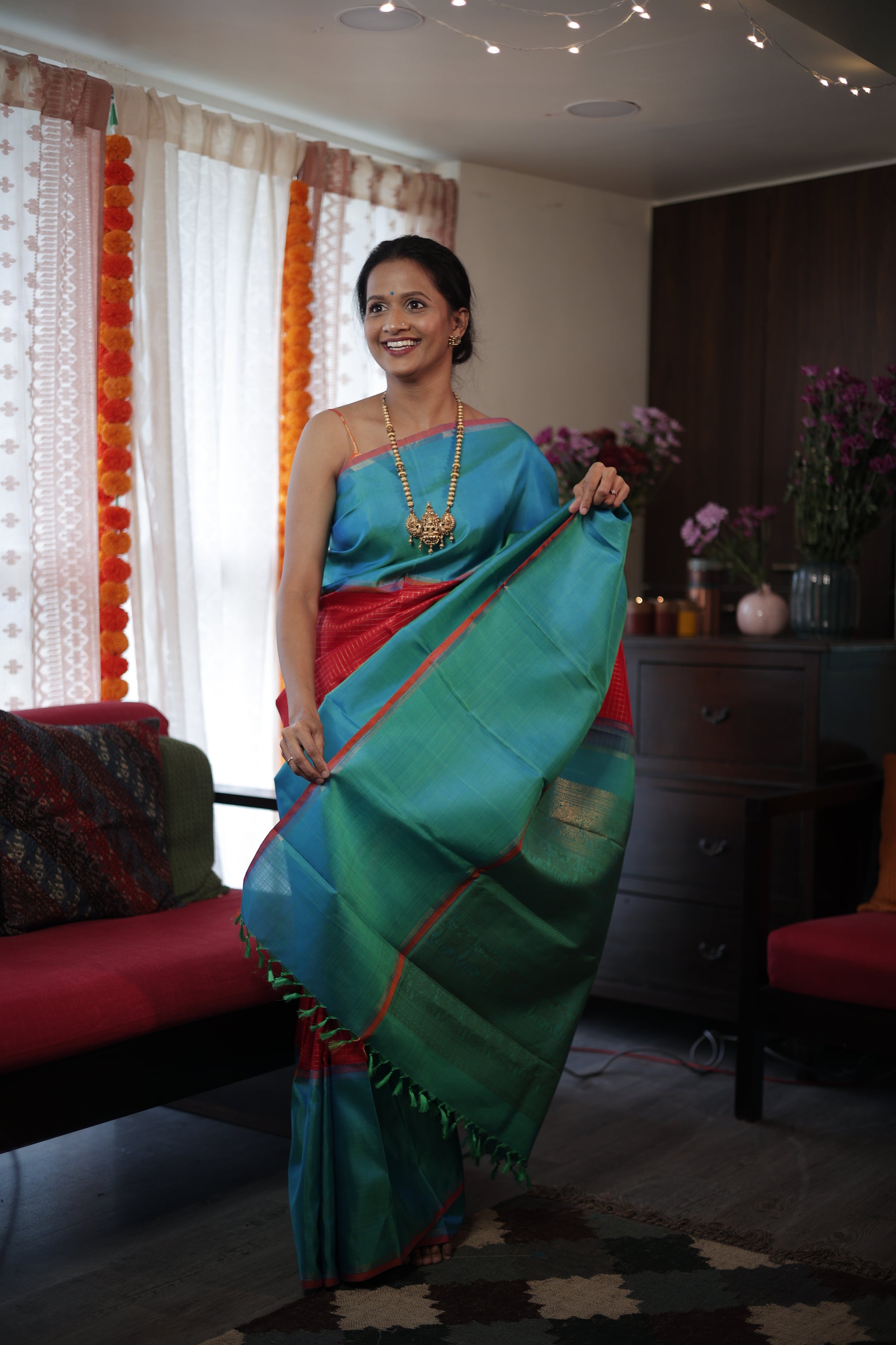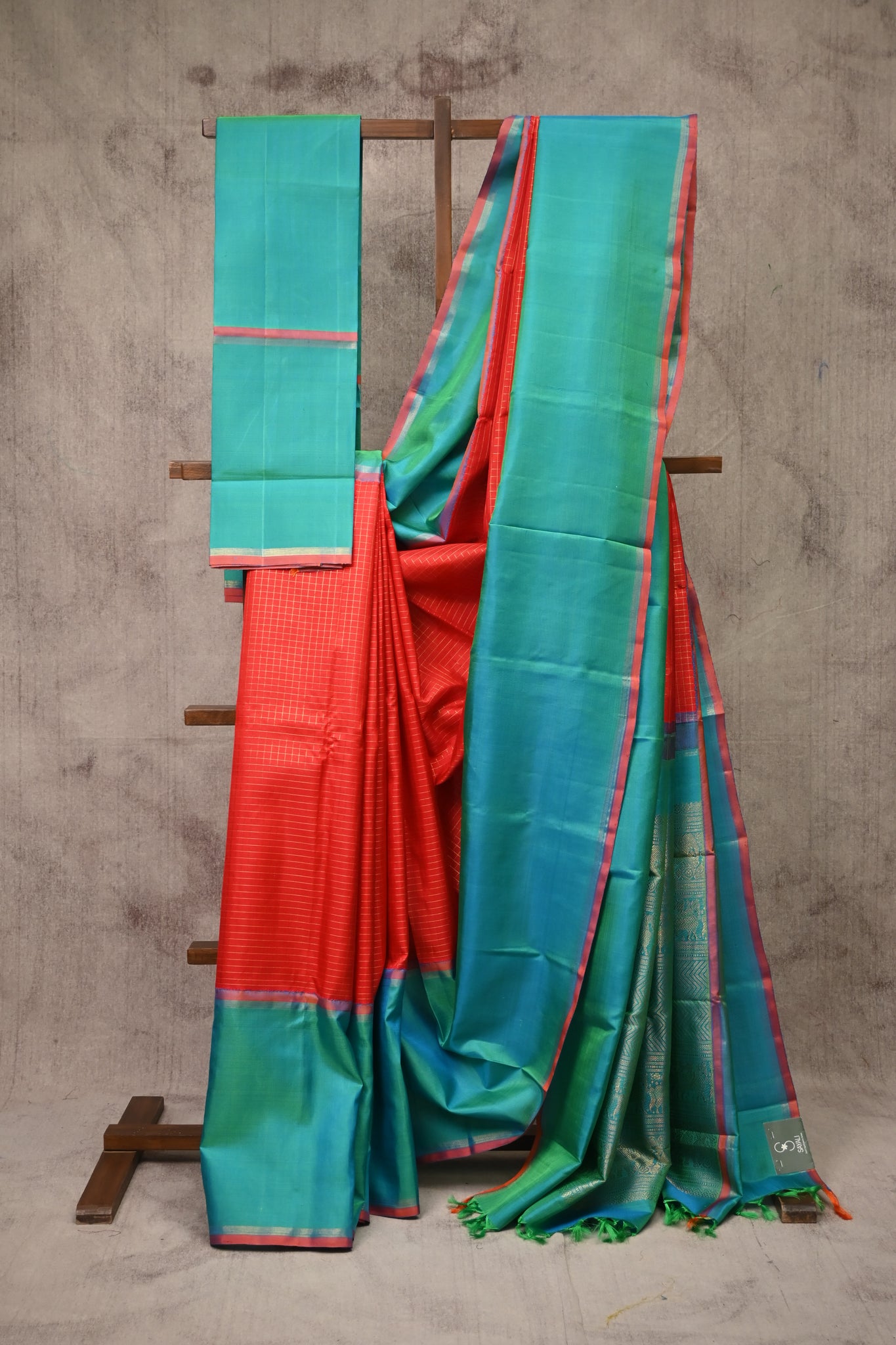 Handloom red-peacock green pure kanjeevaram silk saree with beautiful small orange skirt border and golden checks middle of the saree. Peacock green colour intricate golden zari pallu with tassels and running plain blouse piece with orange border.