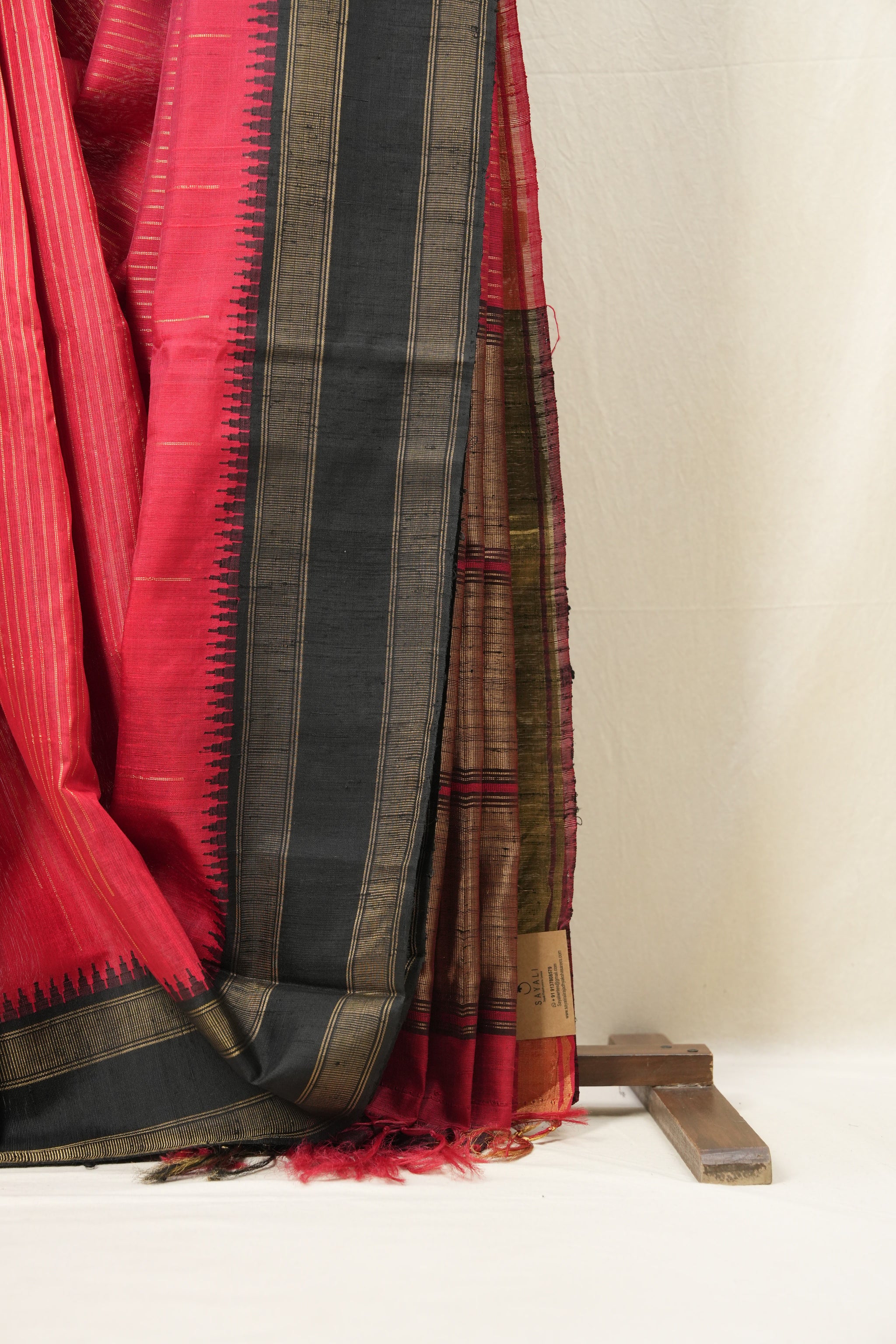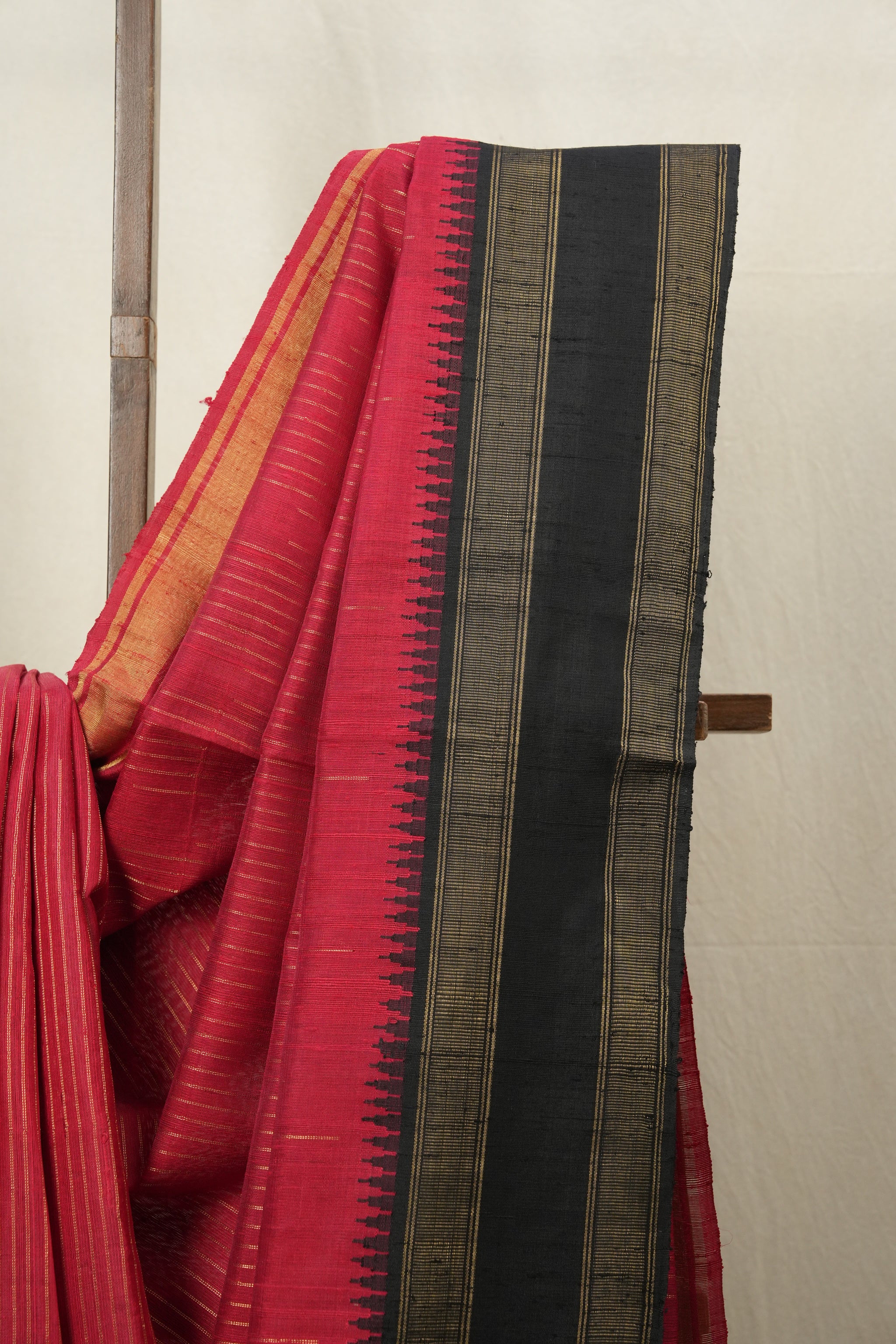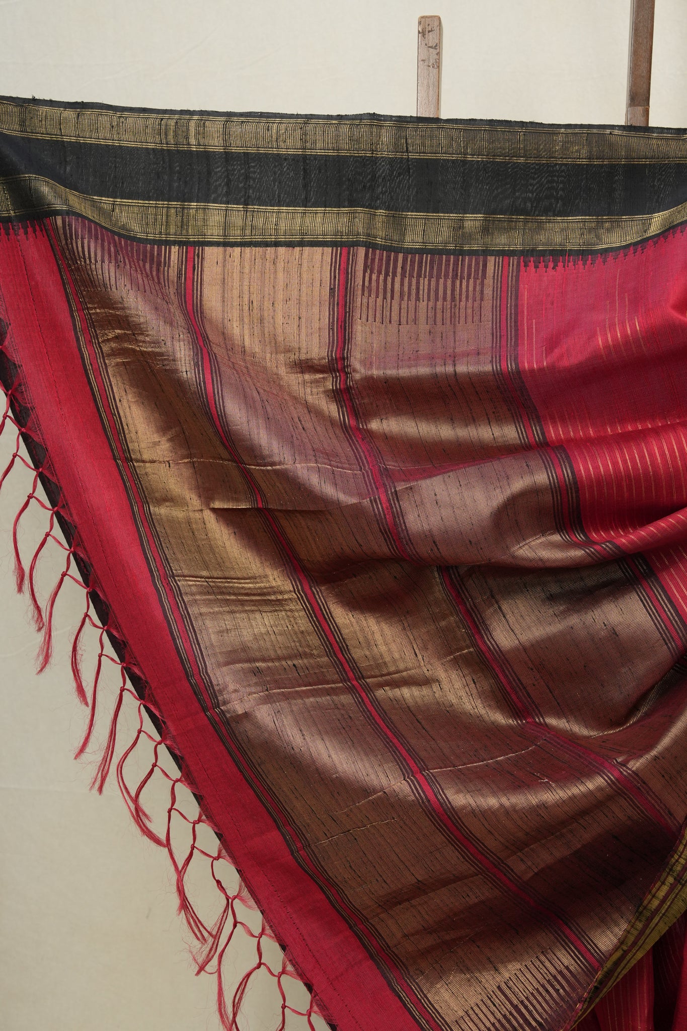 Work - Raw silk saree with all-over stripes, a contrast border, and an attractive golden zari pallu with tassels.