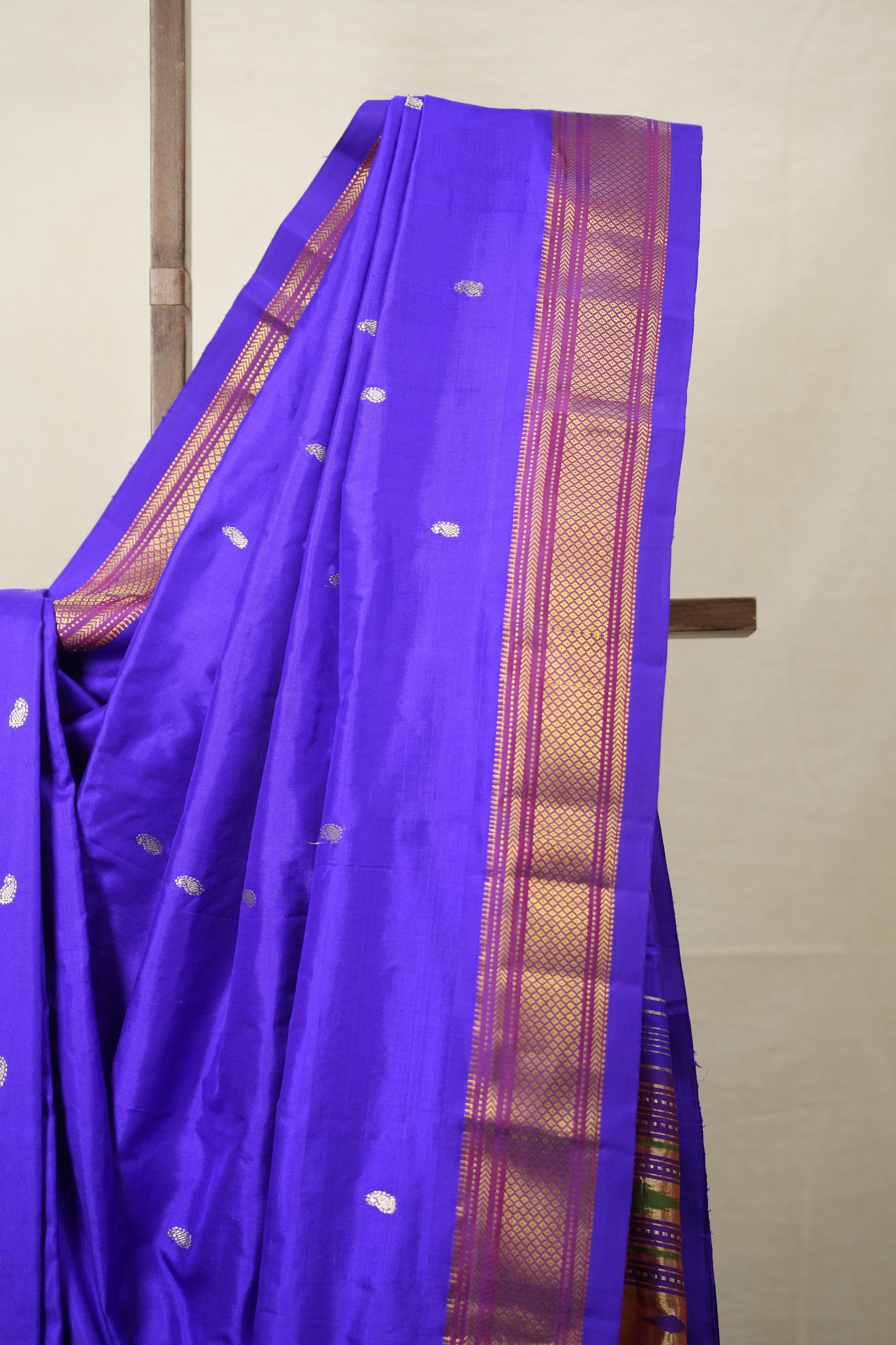 Work - The saree features big woven gold buttas (motifs) on the body, with a broad golden zari border and a rich contrast morbangdi pallu.