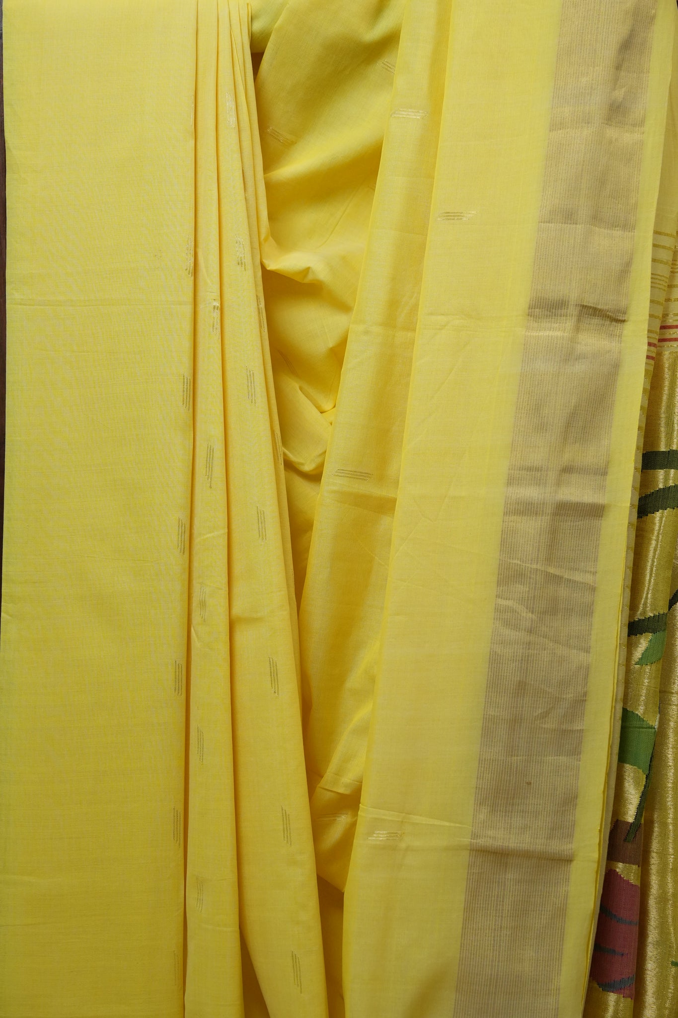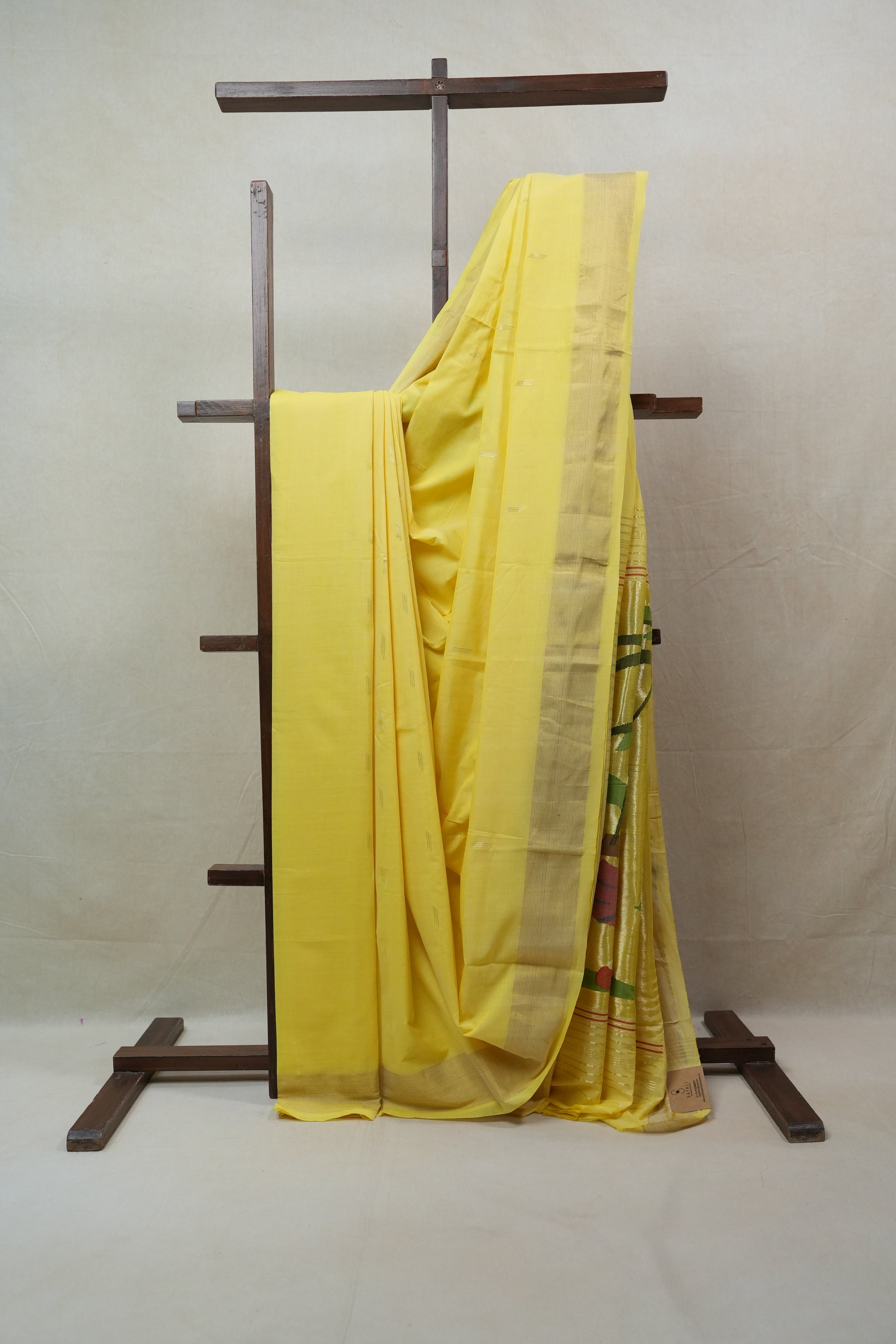 Work - Yellow cotton Paithani saree with golden zari border and traditional colorful pallu.