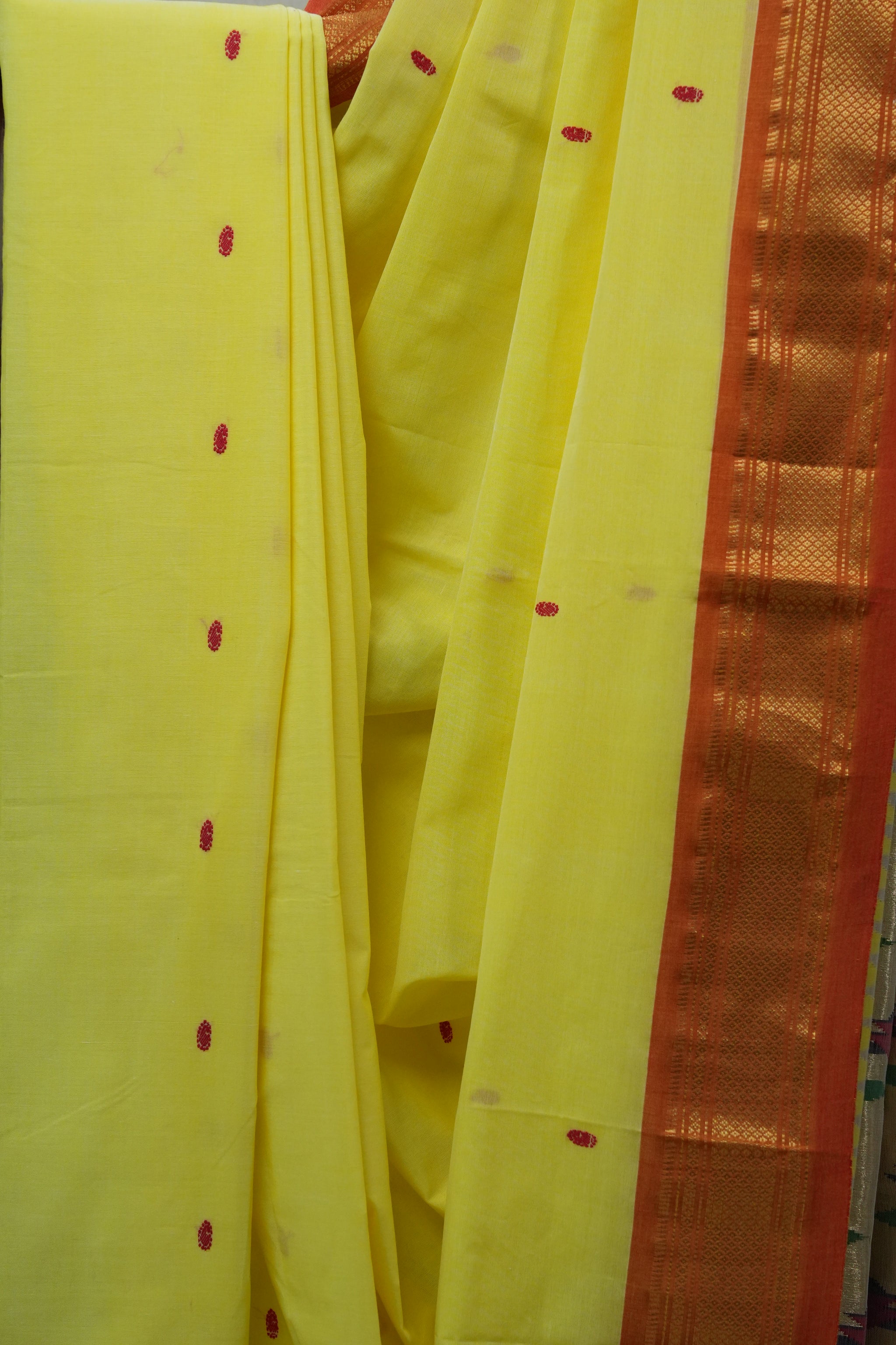 Work - Yellow cotton Paithani saree with golden zari border and traditional colorful pallu.