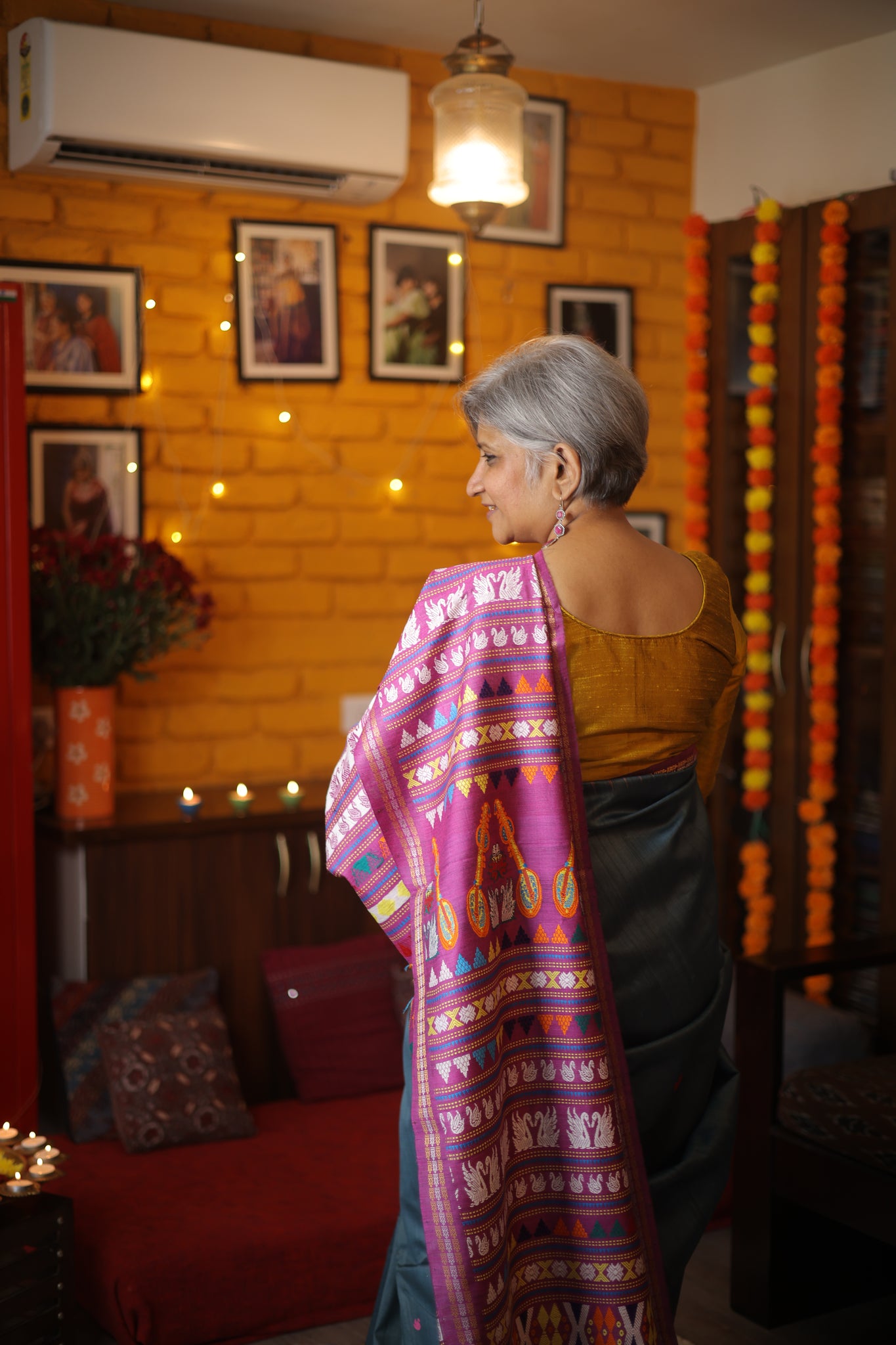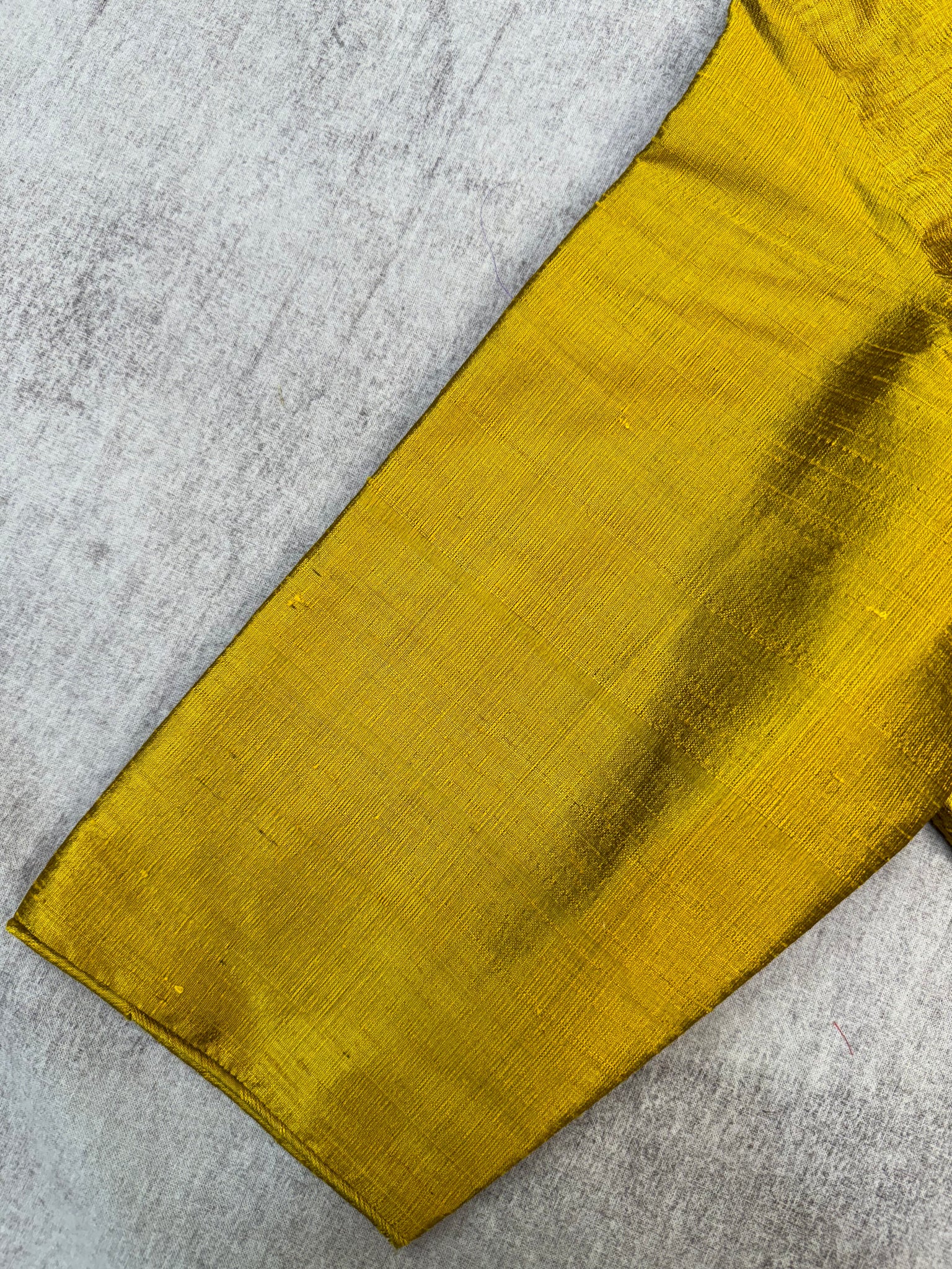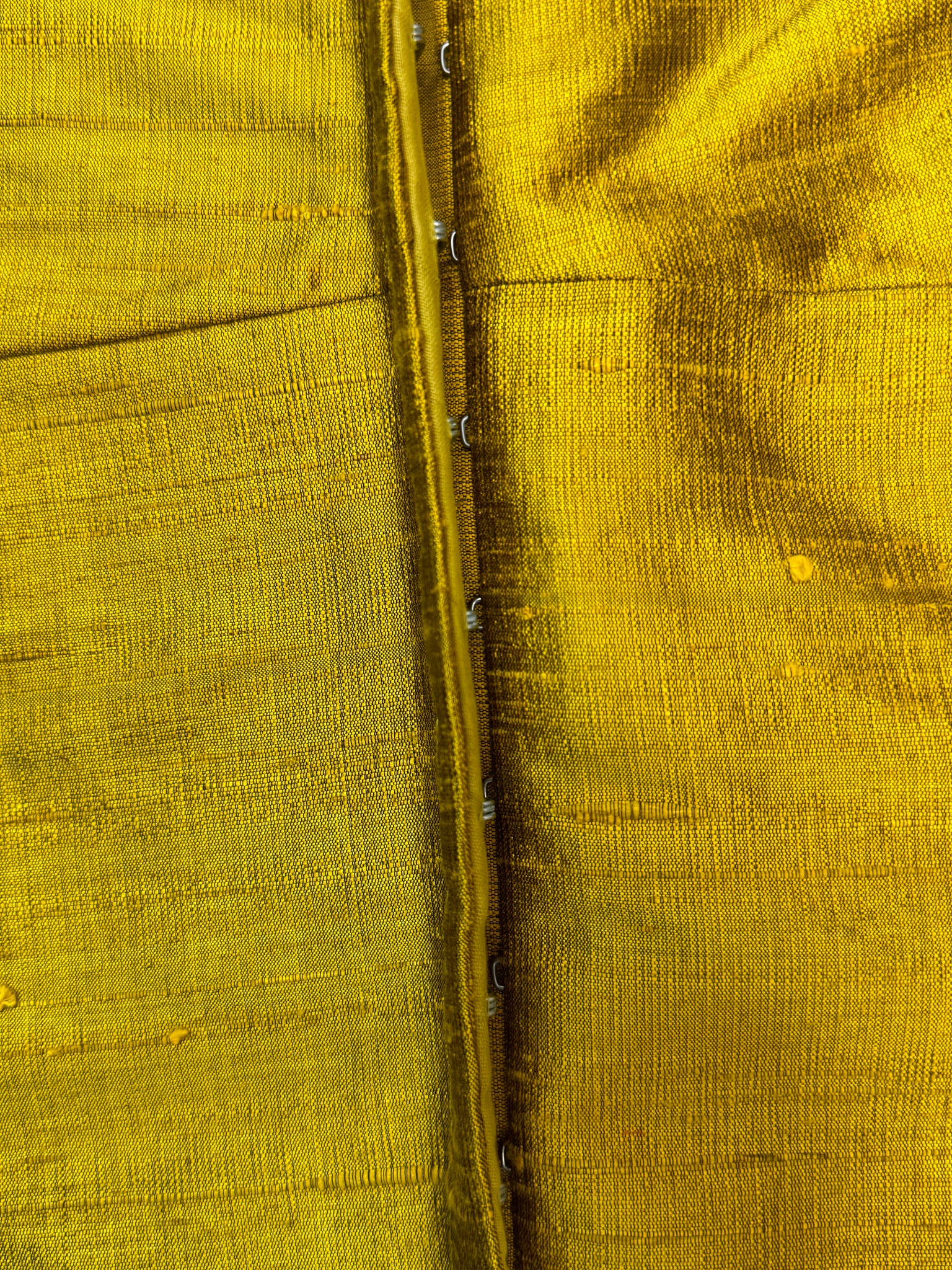Yellow raw silk blouse with round neck back, round neck front and open with hooks, without pads, with cotton lining, princess cut with 2 inches margin inside.