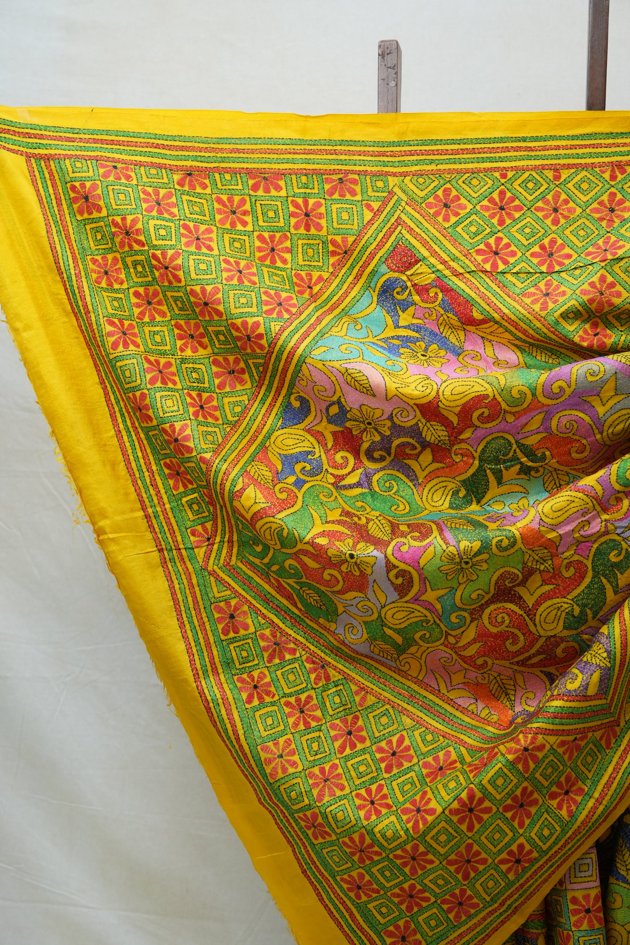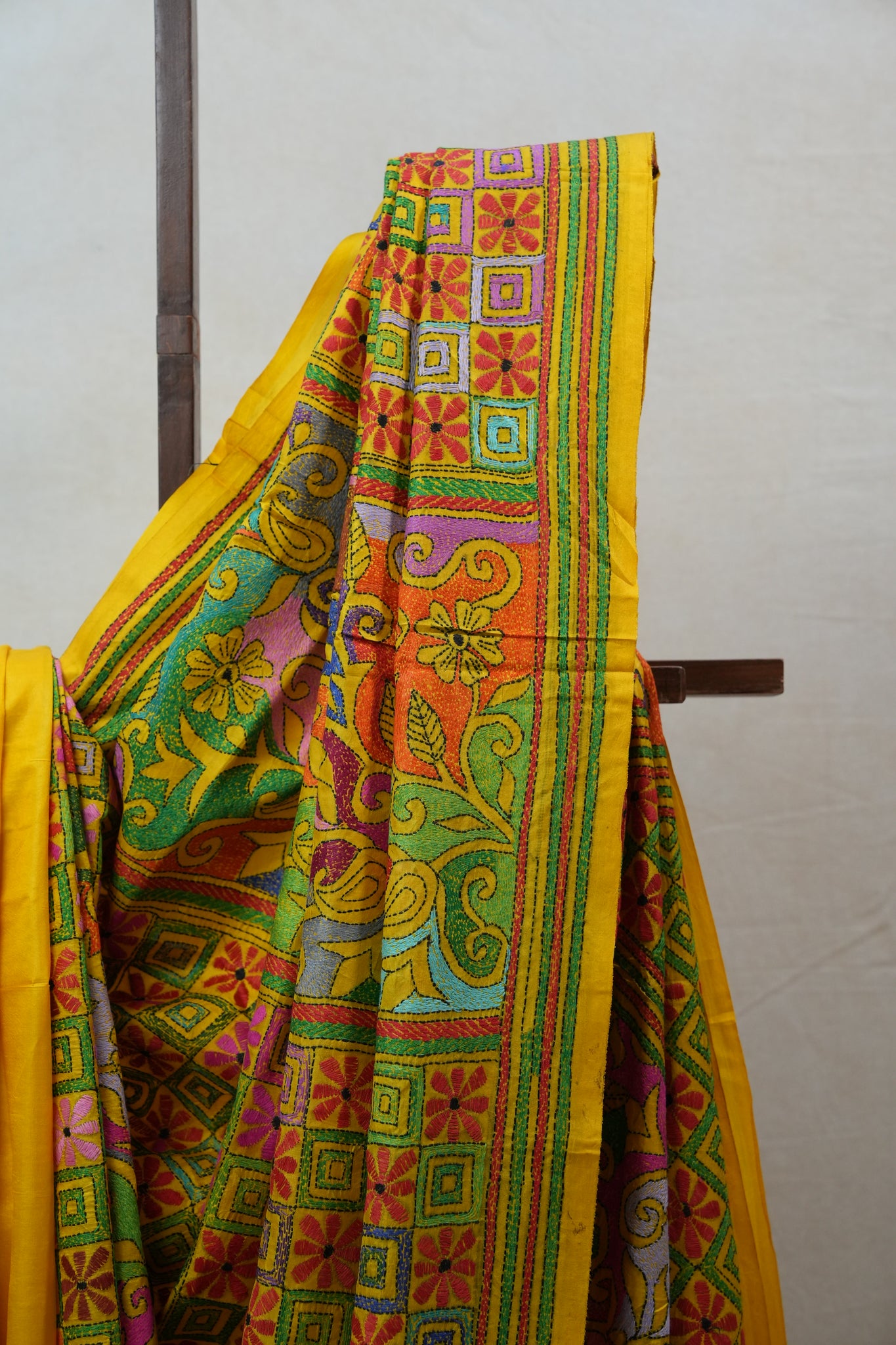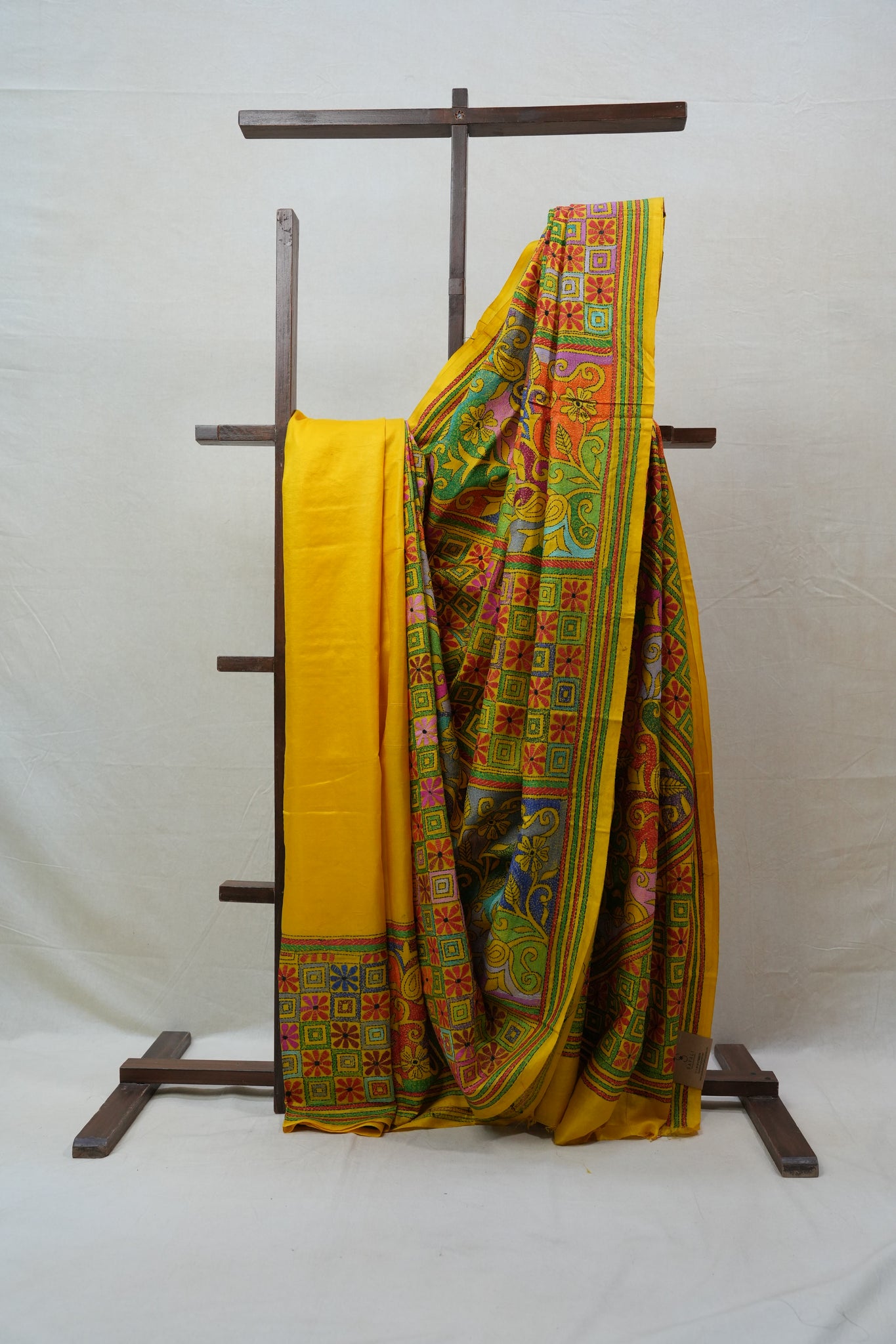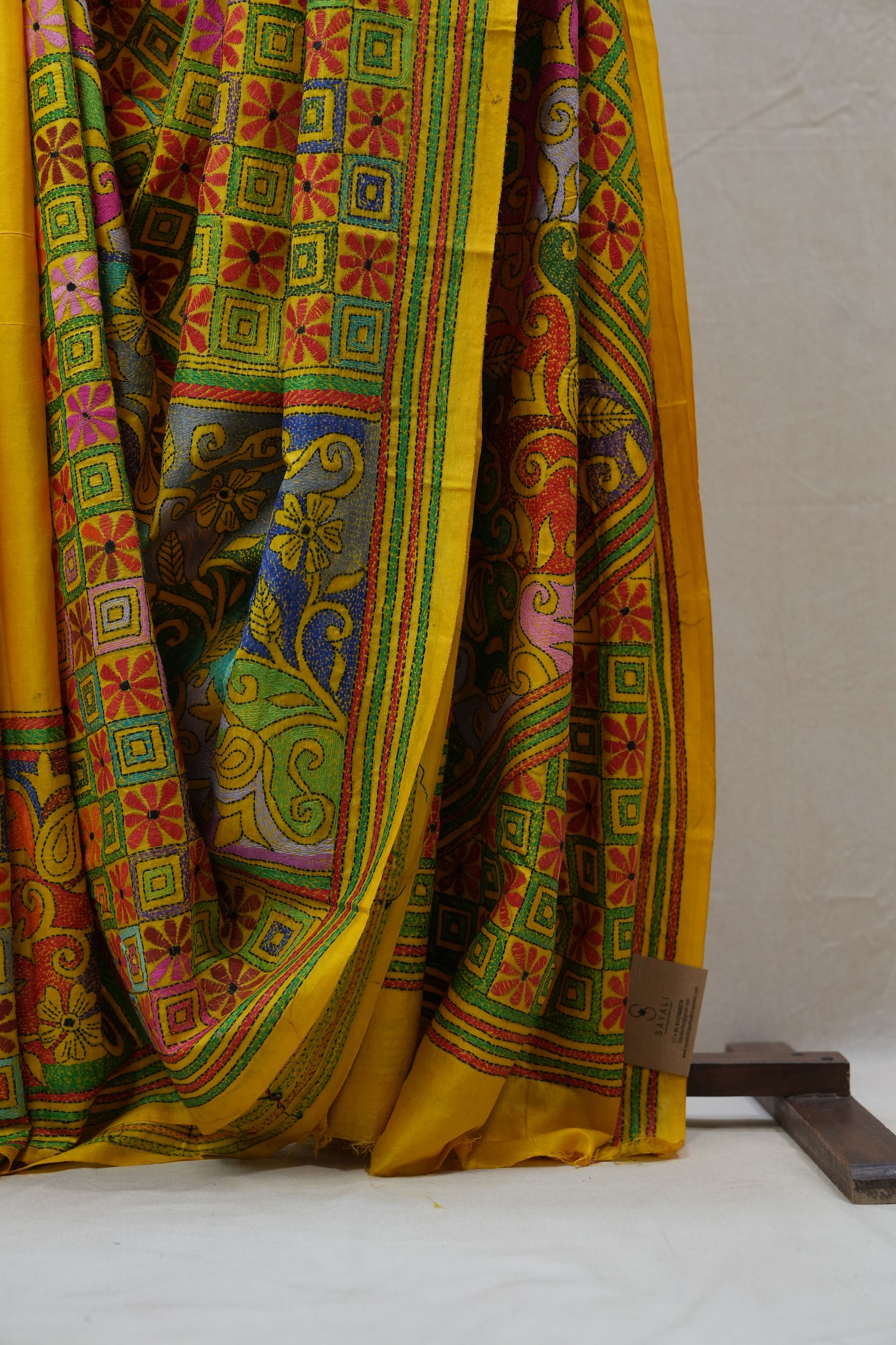 Work - This kantha tussar saree features intricate hand-embroidered kantha work with vibrant floral and paisley motifs.
